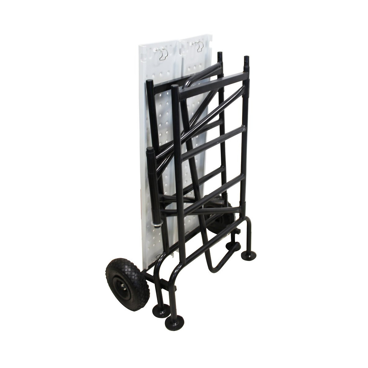 Echafaudage à trois niveaux de travail (32, 56 et 81cm du niveau du sol) avec garde-corps. Modèle pliable avec roue de transport. Charge maximale: 150 kg. Dimension plateau de travail en deux parties et antidérapant: 107 x 40cm. Pour utilisation en extérieur et en poste fixe. A usage domestique. Conforme NF E 85-200.