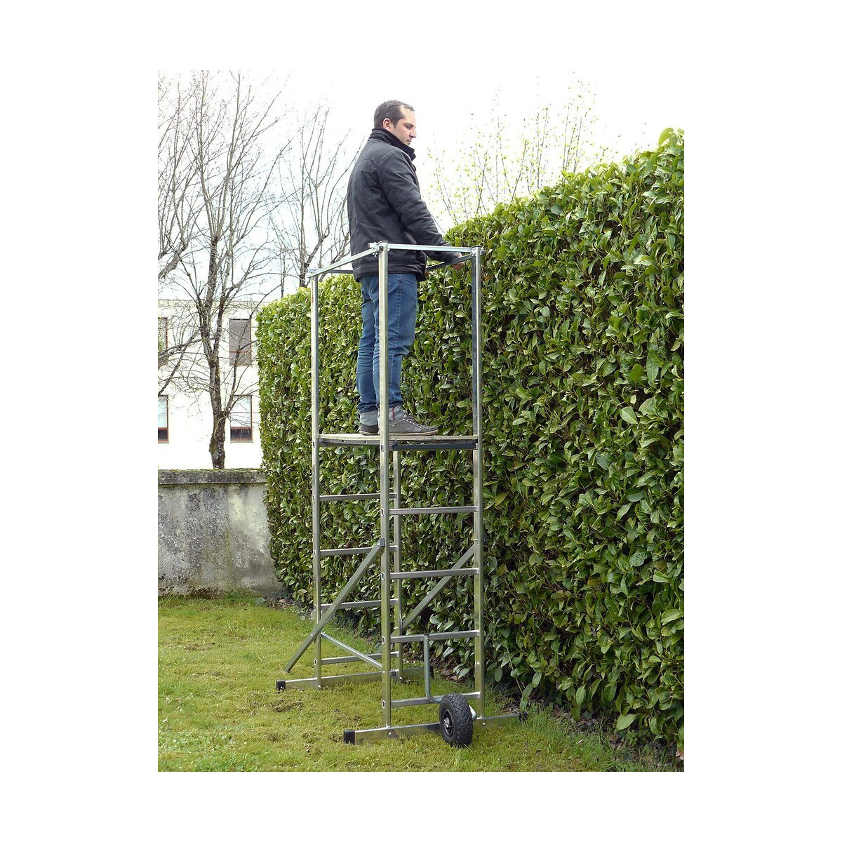 * 2 larges bases stabilisatrices permettant l'utilisation dans le jardin* Garde-corps périphérique total* 2 béquilles anti-basculement pour aider à la montée* Conforme à la norme E85-200, charge max 150 kg PRATIQUE : * Jusqu'à 3M hauteur de travail pour les haies et 3M50 pour la cueillette.* Grand plateau (110x41cm) positionnable à 4 hauteurs différentes (54,83,112 et 140cm)* Légèreté de la structure en aluminium* Roue gonflable de grand diamètre tout terrainSOLIDE : * plateau en aggloméré hydrofuge sur un robuste cadre en acierMontants et barreaux surdimensionnés Garantie 2 ans