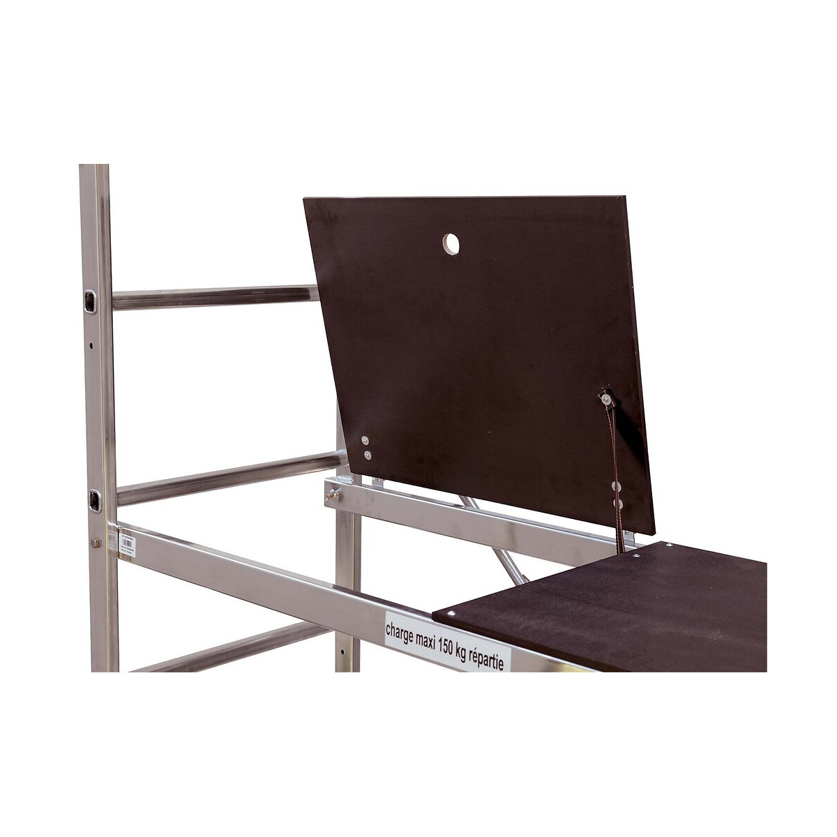 Echafaudage aluminium B4 exclusivement à usage domestique. Hauteur de travail max 4,00m. Stable et léger grâce à sa structure en aluminium. Montage simple par vis et écrous papillons. Fonction rattrapage de niveau (travail en escalier). Plancher en aluminium et en bois antidérapant avec trappe à fermeture automatique. Muni de 2 stabilisateurs en aluminium pour plus de stabilité. Fabrication française. Conforme à la norme européenne E 85-200. Garantie 2 ans. Charge maximale d'utilisation 150kg. Poids 19,00kg.Spécifications techniques