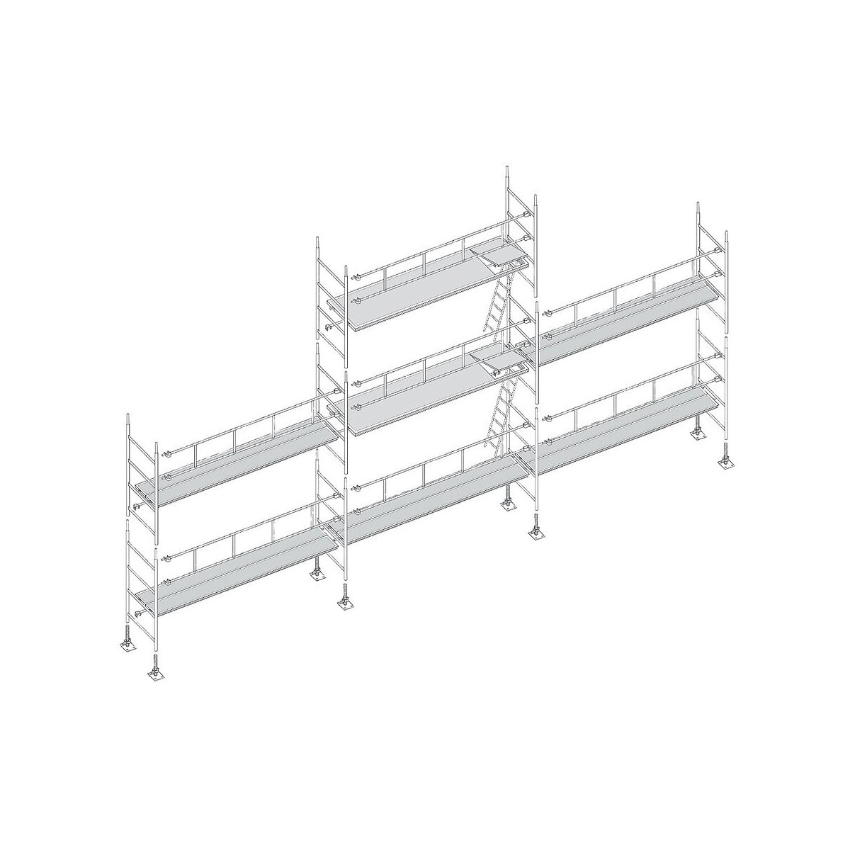 Échafaudage en acier peint (galvanisation en option), fabriqué dans notre usine à Saint-Étienne. Montants des échelles diamètre 45 mm épaisseur 2 mm. Surface de travail confortable de 3 m x 0,80 m. Rattrapage de niveau millimétrique jusqu'à 30 cm grâce aux pieds vérins. Réglage des plateaux tous les 50 cm en hauteur. Système d'accroche à clavettes. Echafaudage conforme aux normes en vigueur : NF EN 12810-1 et 2 et EN 12811-1 et 2 HD 1000 du 20 décembre 1988 (matériaux, dimensions, charges, …) EN 287-1/A1 de 1997 (certificat qualification soudage) Largeur : 0.80 m Longueur : 9 m Hauteur de travail : 7 m au plus haut E51-9 : Structure seule sans plateau. Structure de l'échafaudage : - 8 pieds de 50 cm réglable sur 30 cm - 10 échelles de 2 m - 7 gardes corps de 3 m - 7 barres de lisse de 3 m Planchers : - 10 planchers acier galvanisé de 3 m x 0,36 m - 2 plateaux trappe alu/bois de 3 m x 0,36 m - 2 échelles d'accès en acier Amarrage : - 2 amarrages piton, encrages et colliers - Poids : 563 kgSpécifications techniques