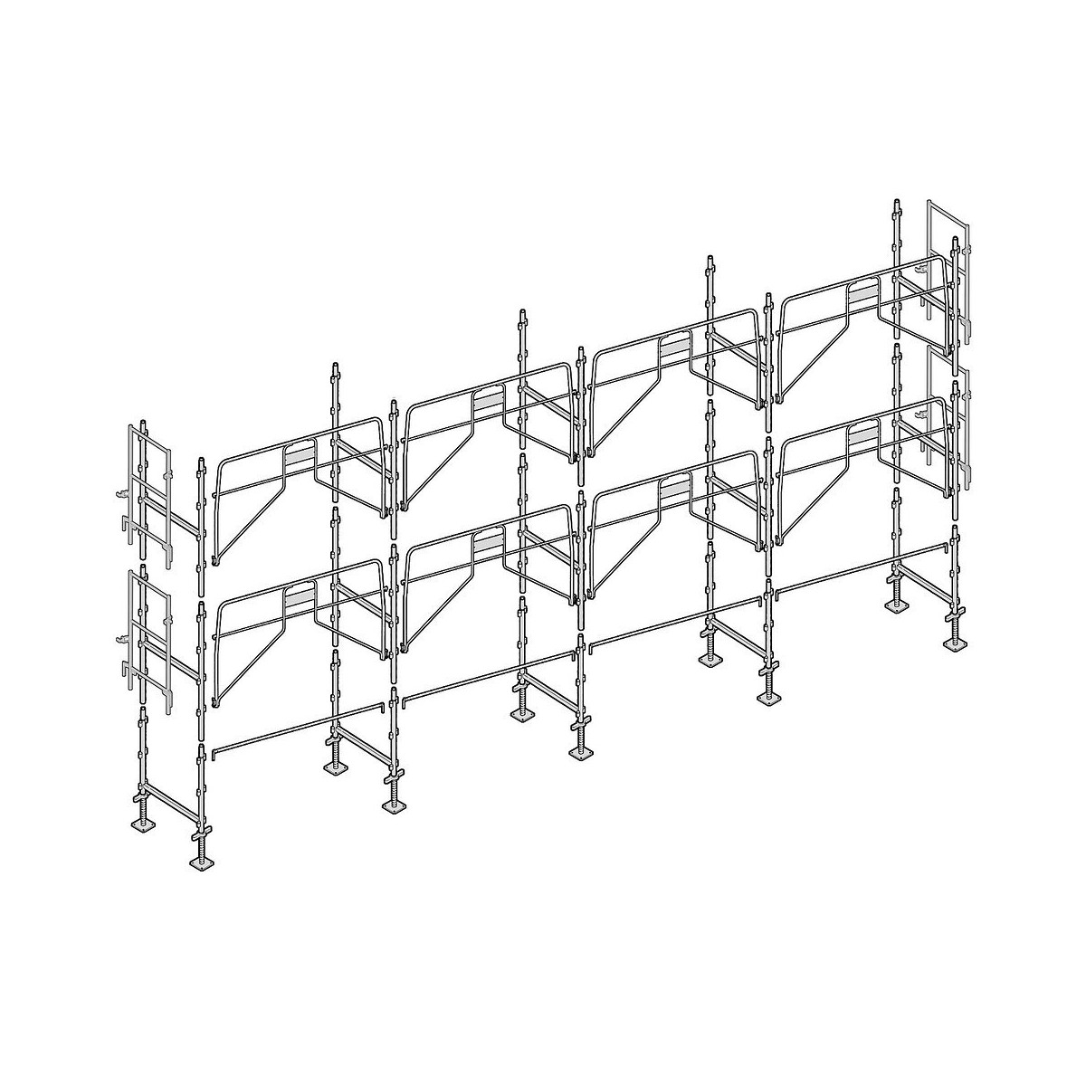 Échafaudage Façadier de 78 m² Cette gamme d'échafaudage galvanisé est robuste et très polyvalent idéal pour les travaux de peinture, ravalement, isolation, couverture, en neuf ou en rénovation et petite maçonnerie. Également apprécié pour sa rapidité au montage. Résistant, léger, longue durée de vie. Largeur : 0,80 m Longueur de travail : 13 m Hauteur de travail : 6 m Classe 4 (300 kg/m2). Montants des échelles diamètre 45 mm, épaisseur 2,2 mm. Nombre d'amarrages recommandés : 1 tous les 24 m² AGS78A : Structure avec Garde-corps sécurité au montage (sans plateau) Composition de l'échafaudage : - 10 vérins de niveau de 60 cm - 5 cadres de départ - 10 échelles de 2 m - 4 lisses de 3 m - 8 gardes corps de sécurité au montage MDS - 4 gardes corps d'extrémité MDSSpécifications techniques
