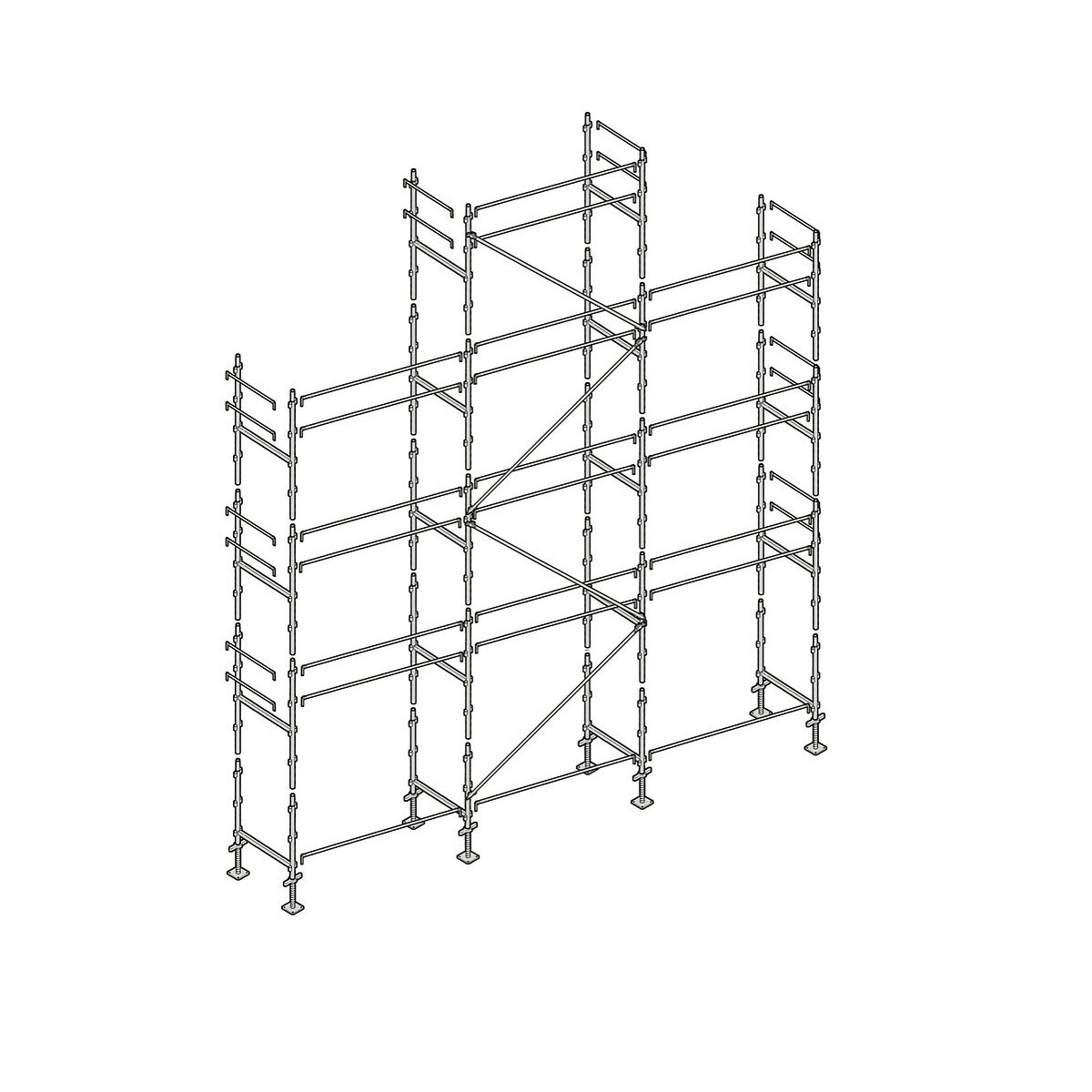 Échafaudage Façadier de 88 m² Cette gamme d'échafaudage galvanisé est robuste et très polyvalent idéal pour les travaux de peinture, ravalement, isolation, couverture, en neuf ou en rénovation et petite maçonnerie. Également apprécié pour sa rapidité au montage. Résistant, léger, longue durée de vie. Largeur : 0,80 m Longueur de travail : 10 m Hauteur de travail : 10 m Classe 4 (300 kg/m2). Montants des échelles diamètre 45 mm, épaisseur 2,2 mm. Nombre d'amarrages recommandés : 1 tous les 24 m² AL88A : Structure avec Lisses (sans plateau) Composition de l'échafaudage : - 8 vérins de niveau de 60 cm - 4 cadres de départ - 14 échelles de 2 m - 23 lisses de 3 m - 16 lisses d'extrémité - 4 diagonales de 3 m x 2 mSpécifications techniques