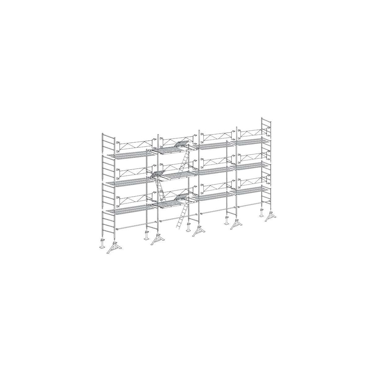 Échafaudage 49 de maçon 104 m². Cette gamme d'échafaudage galvanisé offre aux entreprises de gros oeuvre de nombreuses solutions de montage. Grâce à ses nombreux composants et leur système d'accrochage à 360°, tous les chantiers de maçonnerie et couverture, peuvent être traités sans difficulté. Classe 4 (300 kg/m2) Diamètre des montants de 48,3 mm, épaisseur 2,6 mm. Largeur : 0,95 m Longueur de travail : 13 m Hauteur de travail : 8 m Top16x8c : Échafaudage complet (avec plateaux) Composition de l'échafaudages : - 5 pieds simple - 5 pied fixe - 9 échelles de 2 m sans barreau - 6 échelles de 2 m / 4 barreaux - 2 échelles de 1,50 m / 3 barreaux - 4 entretoises de montage de 3 m - 3 piliers de faîte 1,20 m - 12 gardes corps fixe de 3 m Planchers : - 3 planchers alu/bois trappe 3 m * 0,85 m - 27 planchers acier 3 m * 0,30 m - 3 échelles d'accès en acierSpécifications techniques