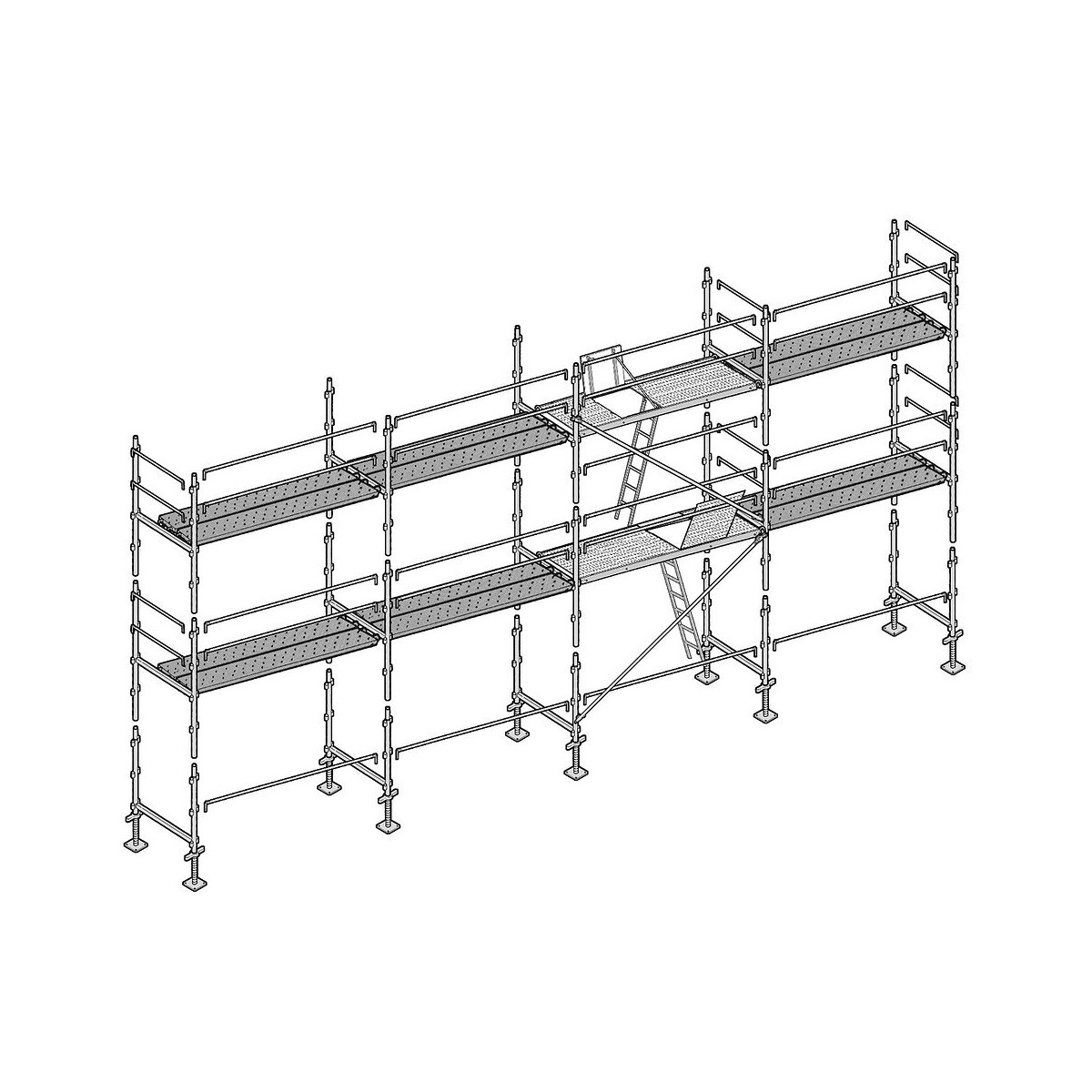 Échafaudage Façadier de 78 m² Cette gamme d'échafaudage galvanisé est robuste et très polyvalent idéal pour les travaux de peinture, ravalement, isolation, couverture, en neuf ou en rénovation et petite maçonnerie. Également apprécié pour sa rapidité au montage. Résistant, léger, longue durée de vie. Largeur : 0,80 m Longueur de travail : 13 m Hauteur de travail : 6 m Classe 4 (300 kg/m2). Montants des échelles diamètre 45 mm, épaisseur 2,2 mm. Nombre d'amarrages recommandés : 1 tous les 24 m² ALP78A : Échafaudage avec Lisses + plateaux Composition de l'échafaudage : - 10 vérins de niveau de 60 cm - 5 cadres de départ - 10 échelles de 2 m - 21 lisses de 3 m - 8 lisses d'extrémité - 2 diagonales de 3 m x 2 m Planchers : - 2 planchers trappe alu/bois de 3 m x 0,75 m - 2 échelles d'accès en acier - 12 planchers en acier de 3 m x 0,36 mSpécifications techniques