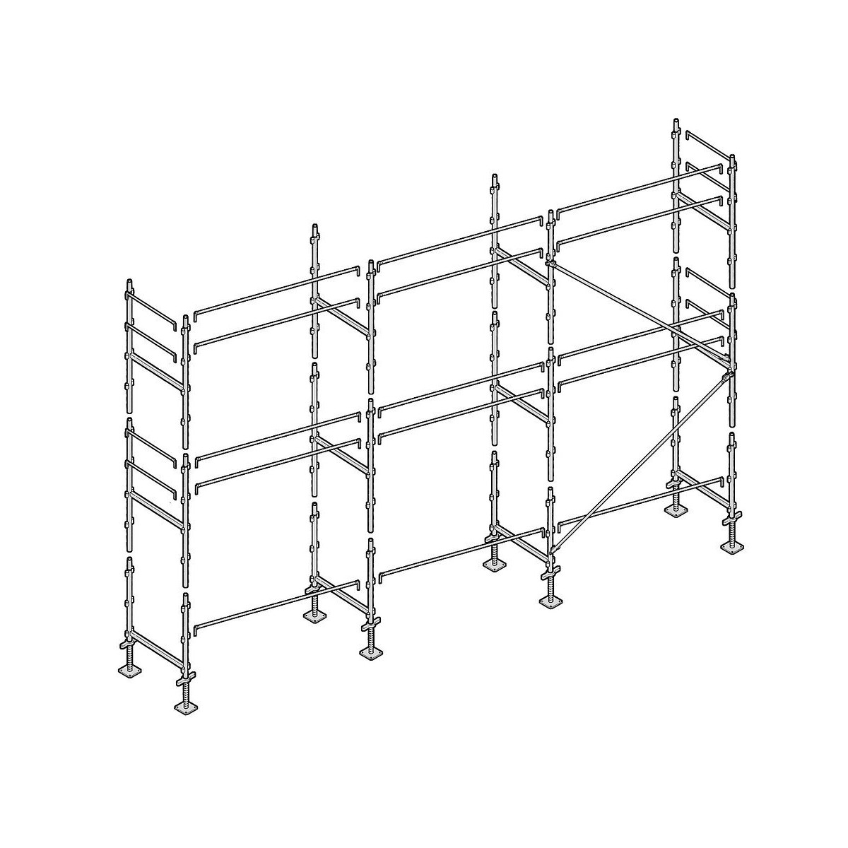 Échafaudage Façadier de 60 m² Cette gamme d'échafaudage galvanisé est robuste et très polyvalent idéal pour les travaux de peinture, ravalement, isolation, couverture, en neuf ou en rénovation et petite maçonnerie. Également apprécié pour sa rapidité au montage. Résistant, léger, longue durée de vie. Largeur : 0,80 m Longueur de travail : 10 m Hauteur de travail : 6 m Classe 4 (300 kg/m2). Montants des échelles diamètre 45 mm, épaisseur 2,2 mm. Nombre d'amarrages recommandés : 1 tous les 24 m² AGP60A : Échafaudage avec Garde-corps + plateaux Composition de l'échafaudage : - 8 vérins de niveau de 60 cm - 4 cadres de départ - 8 échelles de 2 m - 4 lisses de 3 m - 2 diagonales de 3 m x 2 m - 6 gardes corps standard de 3 m - 4 gardes corps d'extrémité standard Plancher : - 2 planchers trappe alu/bois de 3 m x 0,75 m - 2 échelles d'accès en acier - 8 planchers en acier de 3 m x 0,36 m