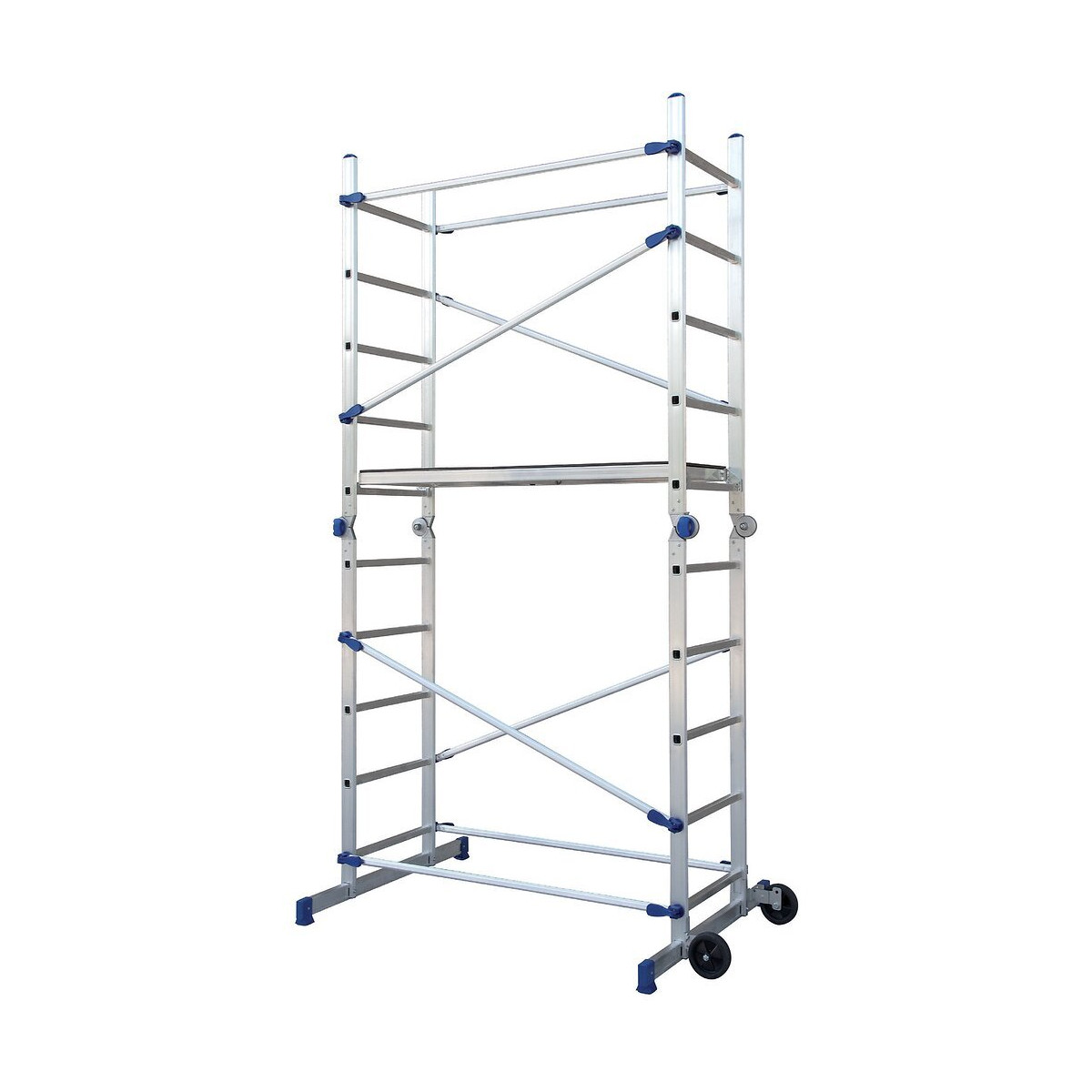 Échafaudage d'une hauteur de travail de 3,80 m. Échafaudage tout aluminium multi-fonctions à usage domestique. Échafaudage d'intérieur : Hauteur de travail : 3,80 m Hauteur d'échafaudage : 3,10 m Longueur : 1,56 m Largeur plateau : 0,51 m Se transforme en 2 échelles doubles ou en 2 échelles simples : 2 Échelles doubles : Hauteur : 1,59 m Hauteur d'accès avec opérateur : 2,88 m 2 Échelles simples : Hauteur droite : 3,10 m Hauteur d'accès avec opérateur : 3,28 m Hauteur Escabeau : 1,53 m Hauteur en Escabeau avec opérateur : 2,86 m Assemblage liaison lisses / diagonales montage très rapide grâce à un système de verrouillage à expansion automatique. Les échelles qui se replient à l'extérieur, permettent de transformer la structure en échafaudage d'intérieur sans démonter la partie du bas.