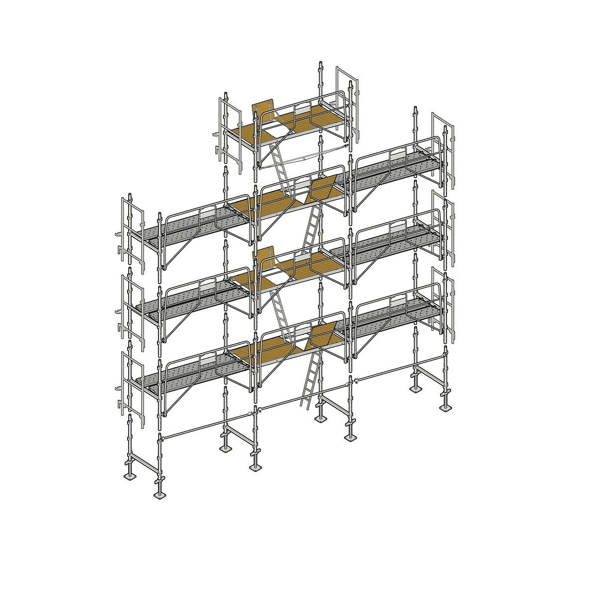 Échafaudage Façadier de 88 m². Cette gamme d'échafaudage galvanisé est adaptée aux travaux de peinture, ravalement, isolation, couverture, en neuf ou en rénovation. Apprécié pour sa rapidité au montage. Résistant, léger, longue durée de vie. Classe 4 (300 kg/m2) avec ses 2 planchers acier. Montants des échelles diamètre 45 mm, épaisseur 2,2 mm. Largeur : 0,80 m Longueur de travail : 10 m Hauteur de travail : 10 m au plus haut Fabrication française Nombre d'amarrages recommandés : 1 tous les 24 m² AGSP88 : Échafaudage avec Garde-corps sécurité au montage + plateaux Composition de l'échafaudage : - 8 vérins de niveau de 60 cm - 4 cadres de départ - 14 échelles de 2 m - 3 lisses de 3 m - 10 gardes corps de sécurité de montage MDS - 8 gardes corps d'extrémité MDS Planchers : - 4 planchers trappe alu/bois de 3 m x 0,75 m - 4 échelles d'accès en acier - 12 planchers en acier de 3 m x 0,36 m - 3 lisses à collier de 3 m