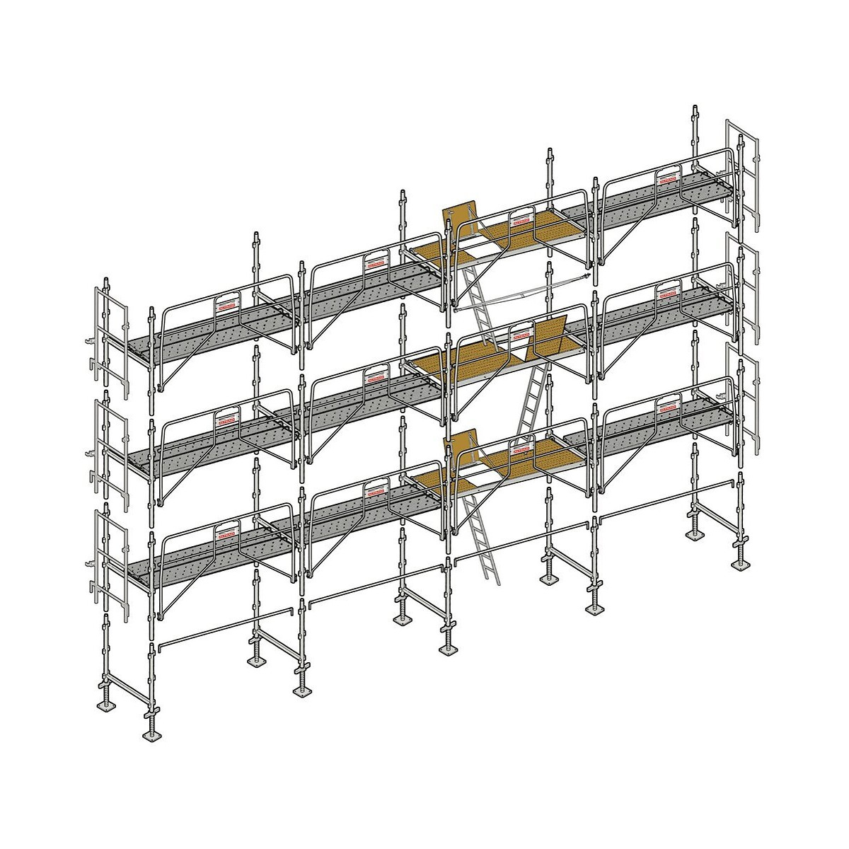 Échafaudage Façadier de 104 m² Cette gamme d'échafaudage galvanisé est robuste et très polyvalent idéal pour les travaux de peinture, ravalement, isolation, couverture, en neuf ou en rénovation et petite maçonnerie. Également apprécié pour sa rapidité au montage. Résistant, léger, longue durée de vie. Largeur : 0,80 m Longueur de travail : 13 m Hauteur de travail : 8 m Classe 4 (300 kg/m2). Montants des échelles diamètre 45 mm, épaisseur 2,2 mm. Nombre d'amarrages recommandés : 1 tous les 24 m² AGSP104A : Échafaudage avec Garde-corps sécurité au montage + plateaux Composition de l'échafaudage : - 10 vérins de niveau de 60 cm - 5 cadres de départ - 15 échelles de 2 m - 4 lisses de 3 m - 12 garde-corps de sécurité au montage MDS - 6 garde-corps d'extrémité MDS Planchers : - 3 planchers trappe alu/bois de 3 m x 0,75 m - 3 échelles d'accès en acier - 18 planchers en acier de 3 m x 0,36 m - 2 lisses à collier de 3 m