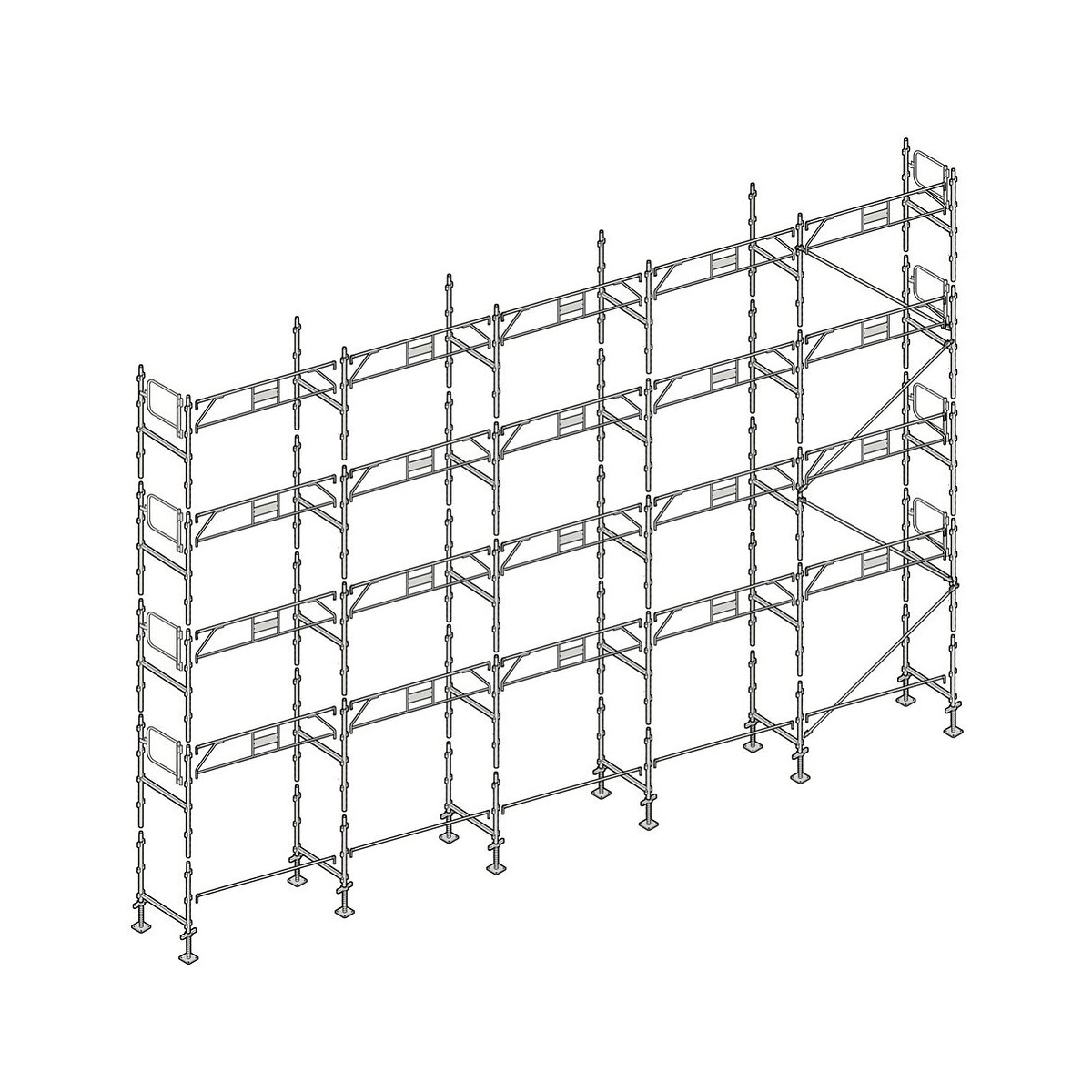 Échafaudage Façadier de 160 m² Cette gamme d'échafaudage galvanisé est robuste et très polyvalent idéal pour les travaux de peinture, ravalement, isolation, couverture, en neuf ou en rénovation et petite maçonnerie. Également apprécié pour sa rapidité au montage. Résistant, léger, longue durée de vie. Largeur : 0,80 m Longueur de travail : 16 m Hauteur de travail : 10 m Classe 4 (300 kg/m2). Montants des échelles diamètre 45 mm, épaisseur 2,2 mm. Nombre d'amarrages recommandés : 1 tous les 24 m² AG160A : Structure avec Garde-corps (sans plateau) Composition de l'échafaudage : - 12 vérins de niveau de 60 cm - 6 cadres de départ - 24 échelles de 2 m - 5 lisses de 3 m - 4 diagonales de 3 m x 2 m - 20 garde-corps standard de 3 m - 8 garde-corps d'extrémité standard