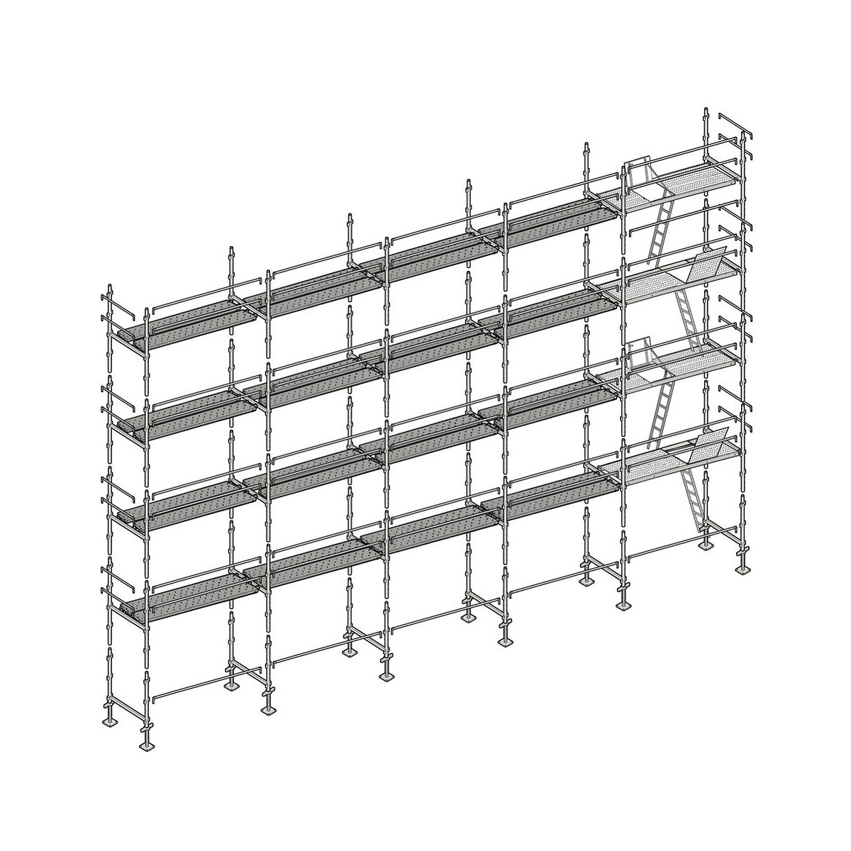 Échafaudage Façadier de 160 m² Cette gamme d'échafaudage galvanisé est robuste et très polyvalent idéal pour les travaux de peinture, ravalement, isolation, couverture, en neuf ou en rénovation et petite maçonnerie. Également apprécié pour sa rapidité au montage. Résistant, léger, longue durée de vie. Largeur : 0,80 m Longueur de travail : 16 m Hauteur de travail : 10 m Classe 4 (300 kg/m2). Montants des échelles diamètre 45 mm, épaisseur 2,2 mm. Nombre d'amarrages recommandés : 1 tous les 24 m² ALP160A : Échafaudage avec Lisses + plateaux Composition de l'échafaudage : - 12 vérins de niveau de 60 cm - 6 cadres de départ - 24 échelles de 2 m - 48 lisses de 3 m - 16 lisses d'extrémité - 4 diagonale de 3 m x 2 m Planchers : - 4 planchers trappe alu/bois de 3 m x 0,75 m - 4 échelles d'accès en acier - 32 planchers en acier de 3 m x 0,36 m