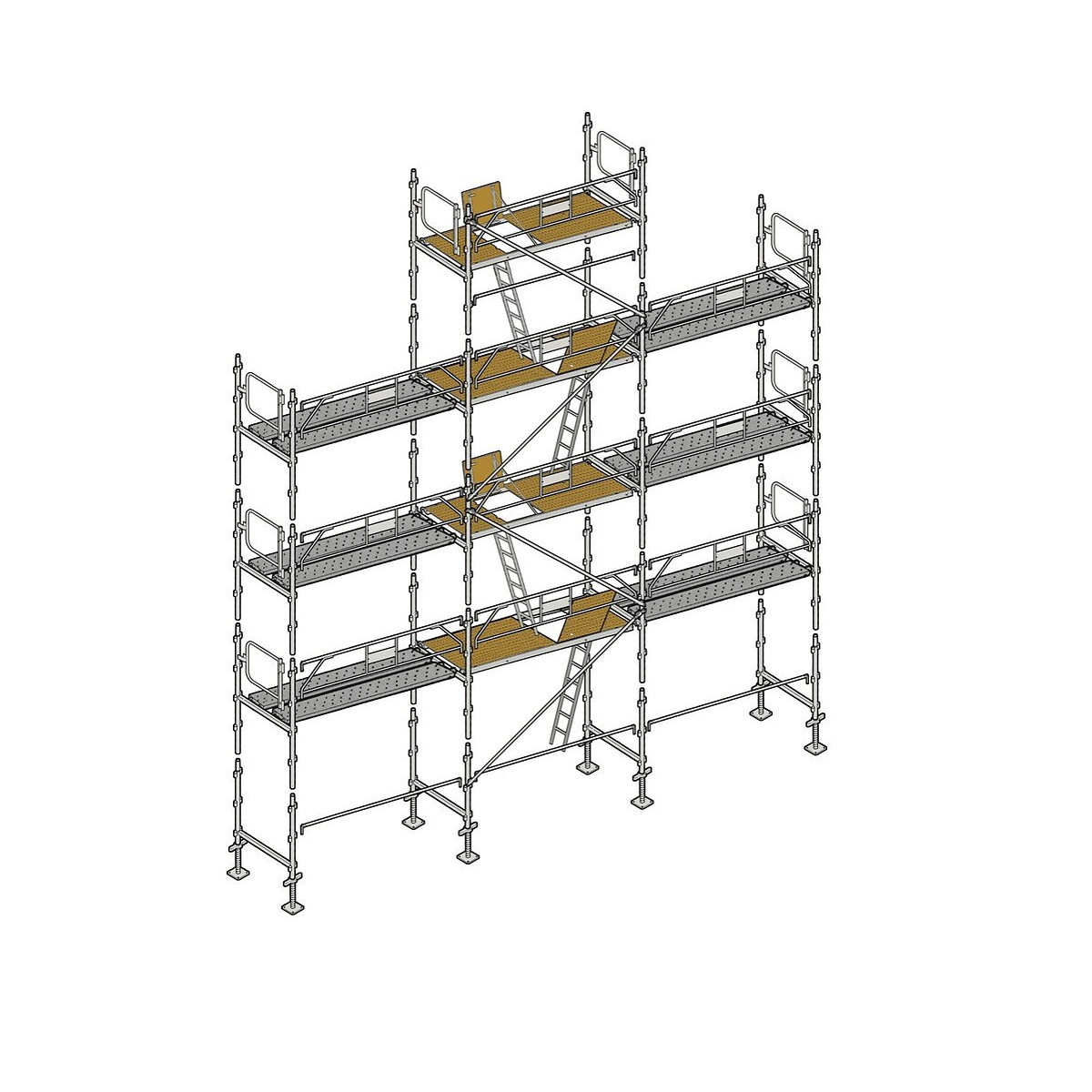 Échafaudage Façadier de 88 m². Cette gamme d'échafaudage galvanisé est adaptée aux travaux de peinture, ravalement, isolation, couverture, en neuf ou en rénovation. Apprécié pour sa rapidité au montage. Résistant, léger, longue durée de vie. Classe 4 (300 kg/m2) avec ses 2 planchers acier. Montants des échelles diamètre 45 mm, épaisseur 2,2 mm. Largeur : 0,80 m Longueur de travail : 10 m Hauteur de travail : 10 m au plus haut Fabrication française Nombre d'amarrages recommandés : 1 tous les 24 m² AGP88 : Échafaudage avec Garde-corps + plateaux Composition de l'échafaudage : - 8 vérins de niveau de 60 cm - 4 cadres de départ - 14 échelles de 2 m - 6 lisses de 3 m - 4 diagonales de 3 m x 2 m - 10 gardes corps standard de 3 m - 8 gardes corps d'extrémité standard Planchers : - 4 planchers trappe alu/bois de 3 m x 0,75 m - 4 échelles d'accès en acier - 12 planchers en acier de 3 m x 0,36 m