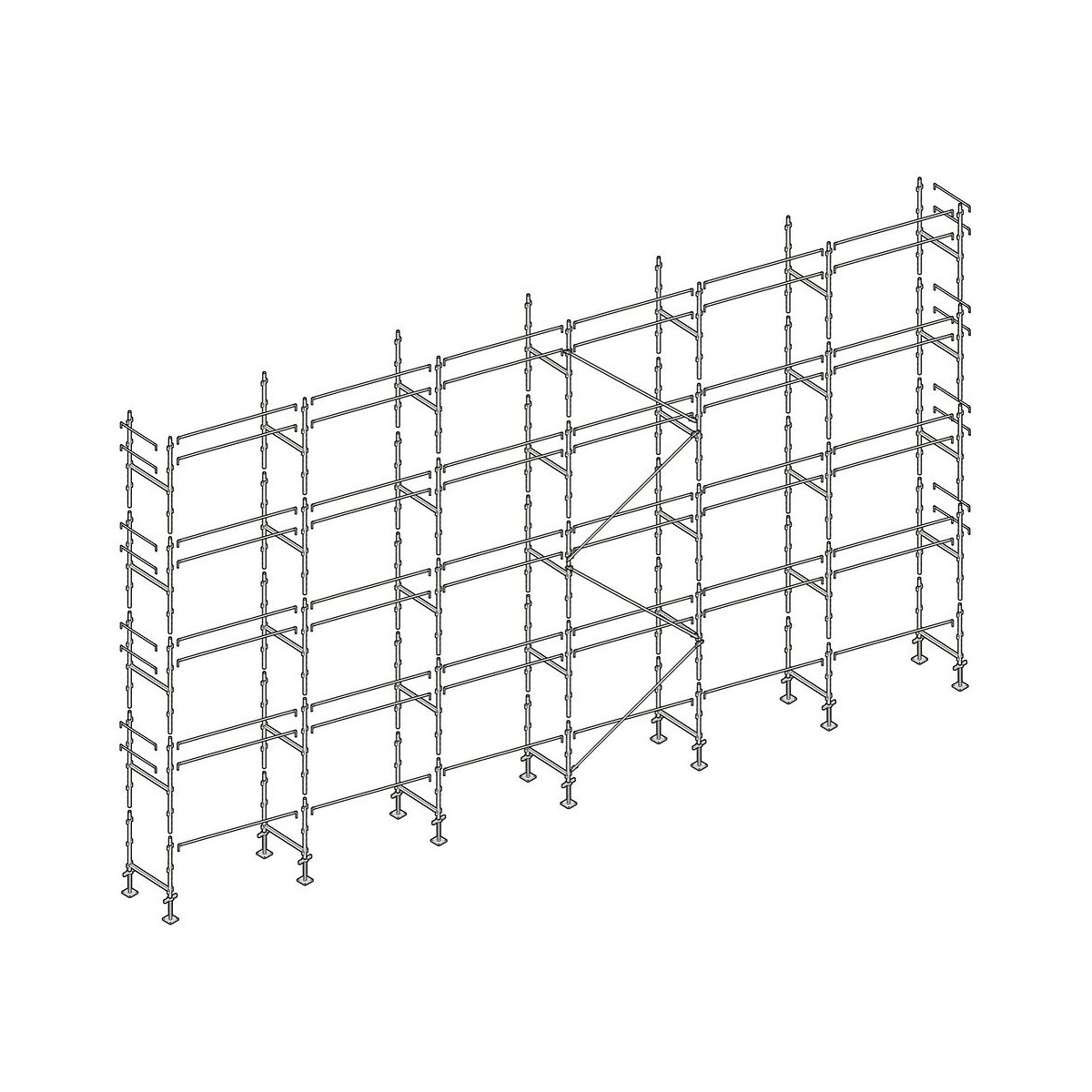 Échafaudage Façadier de 190 m² Cette gamme d'échafaudage galvanisé est robuste et très polyvalent idéal pour les travaux de peinture, ravalement, isolation, couverture, en neuf ou en rénovation et petite maçonnerie. Également apprécié pour sa rapidité au montage. Résistant, léger, longue durée de vie. Largeur : 0,80 m Longueur de travail : 19 m Hauteur de travail : 10 m Classe 4 (300 kg/m2). Montants des échelles diamètre 45 mm, épaisseur 2,2 mm. Nombre d'amarrages recommandés : 1 tous les 24 m² AL190A : Structure avec Lisses (sans plateau) Composition de l'échafaudage : - 14 vérins de niveau de 60 cm - 7 cadres de départ - 28 échelles de 2 m - 54 lisses de 3 m - 16 lisses d'extrémité - 4 diagonales de 3 m x 2 m