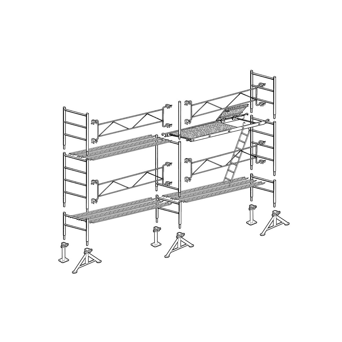 Échafaudage 49 de maçon 35 m². Cette gamme d'échafaudage galvanisé offre aux entreprises de gros oeuvre de nombreuses solutions de montage. Grâce à ses nombreux composants et leur système d'accrochage à 360°, tous les chantiers de maçonnerie et couverture, peuvent être traités sans difficulté. Classe 4 (300 kg/m2) Diamètre des montants de 48,3 mm, épaisseur 2,6 mm. Largeur : 0,95 m Longueur : de travail 7 m Hauteur de travail : 5 m Top7x5p : Échafaudage avec 1 niveau de plateaux acier Composition de l'échafaudage : - 3 pieds simple - 3 pieds fixe - 1 échelles de 2 m sans barreau - 2 échelles de 2 m / 4 barreaux - 2 échelles de 1,50 m / 3 barreaux - 3 échelles de 0,85 m / 2 barreaux - 1 piliers de faîte de 1,20 m - 4 gardes corps fixe de 3 m Planchers : - 1 plancher alu/bois trappe 3 m * 0,85 m - 9 planchers acier 3 m * 0,30 m - 1 échelle d'accès en acier