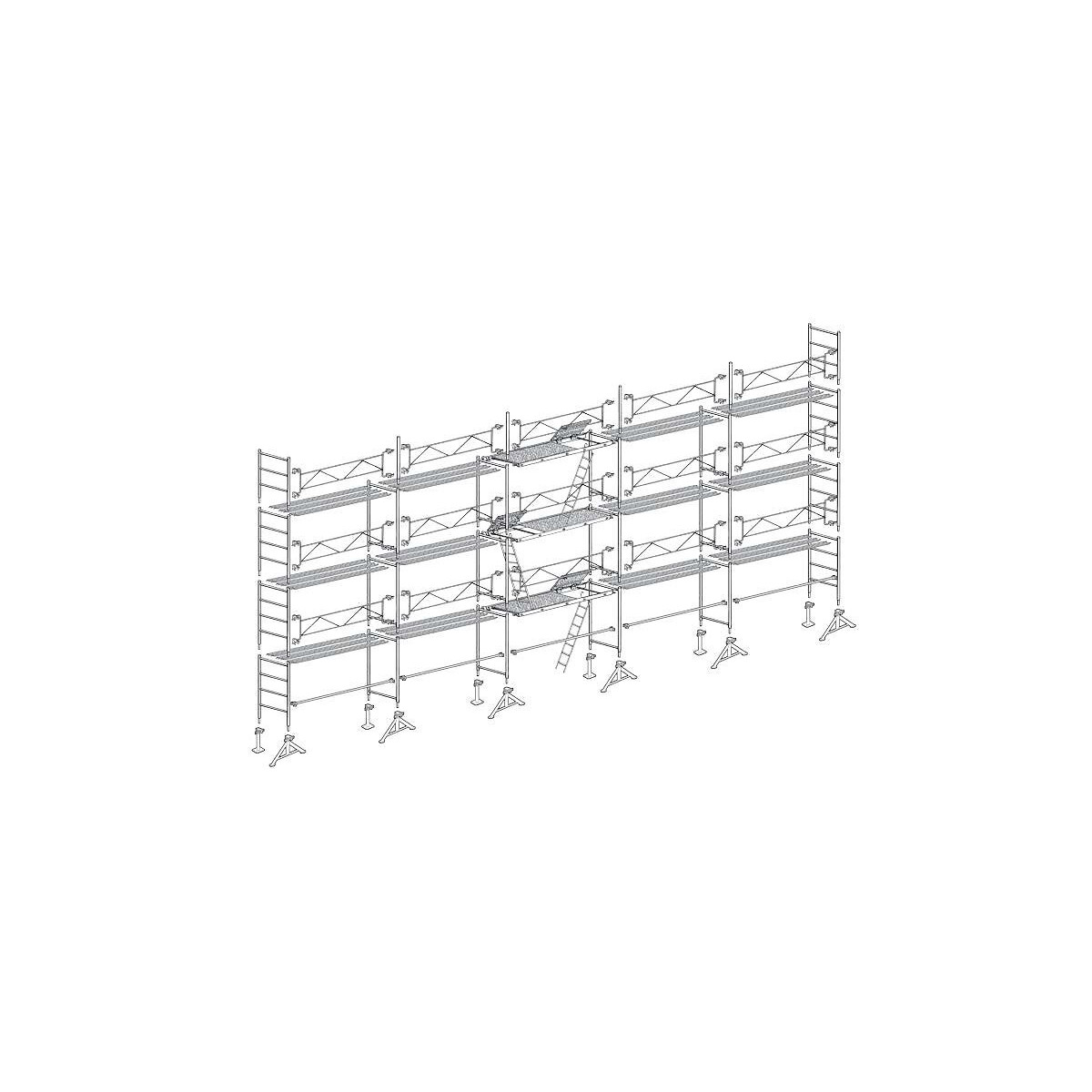 Échafaudage 49 de maçon 128 m². Cette gamme d'échafaudage galvanisé offre aux entreprises de gros oeuvre de nombreuses solutions de montage. Grâce à ses nombreux composants et leur système d'accrochage à 360°, tous les chantiers de maçonnerie et couverture, peuvent être traités sans difficulté. Classe 4 (300 kg/m2) Diamètre des montants de 48,3 mm, épaisseur 2,6 mm. Largeur : 0,95 m Longueur de travail : 16 m Hauteur de travail : 8 m Top16x8c : Échafaudage complet (avec plateaux) Composition de l'échafaudage : - 6 pieds simple - 6 pieds fixe - 12 échelles de 2 m sans barreau - 6 échelles de 2 m / 4 barreaux - 2 échelles de 1,50 m / 3 barreaux - 5 entretoises de montage de 3 m - 4 piliers de faîte de 1,20 m - 15 gardes corps fixe de 3 m Planchers : - 3 planchers alu/bois trappe 3 m * 0,85 m - 36 planchers en acier 3 m * 0,30 m - 3 échelles d'accès en acier