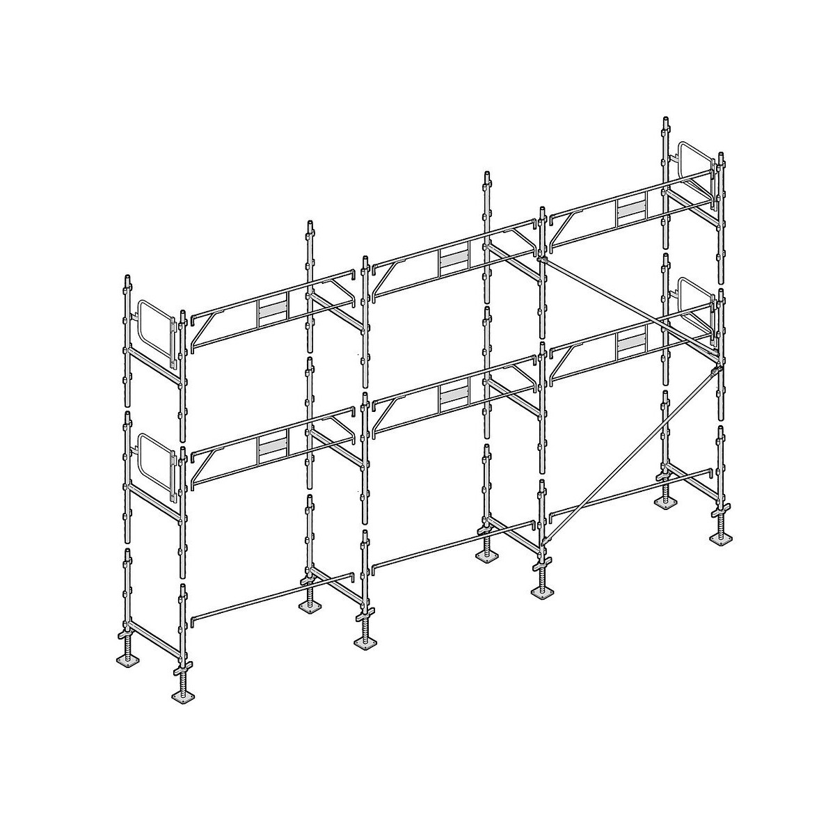 Échafaudage Façadier de 60 m². Cette gamme d'échafaudage galvanisé est adaptée aux travaux de peinture, ravalement, isolation,couverture, en neuf ou en rénovation. Apprécié pour sa rapidité au montage. Résistant, léger, longue durée de vie. Classe 4 (300 kg/m2). Montants des échelles diamètre 45 mm, épaisseur 2,2 mm. Largeur : 0.80 m Longueur de travail : 10 m Hauteur de travail : 6 m Fabrication française Nombre d'amarrages recommandés : 1 tous les 24 m² AG60 : Structure avec Garde-corps (sans plateau) Composition de l'échafaudage : - 8 vérins de niveau de 60 cm - 4 cadres de départ - 8 échelles de 2 m - 3 lisses de 3 m - 2 diagonales de 3 m x 2 m - 6 gardes corps standard de 3 m - 4 gardes corps d'extrémité standard