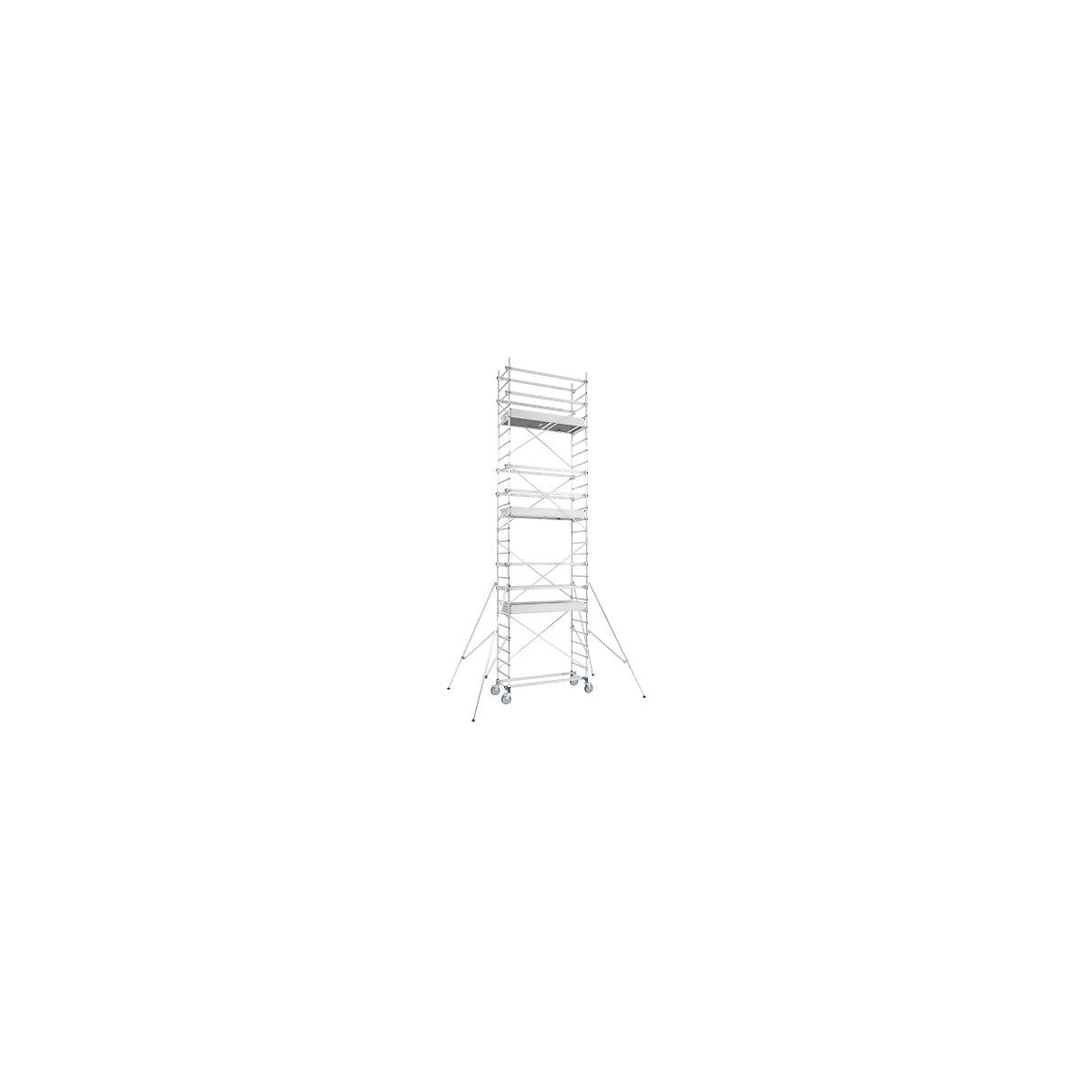 Le CROSS 180 est un échafaudage roulant en aluminium à usage professionnel. Équipé de roues à blocage bidirectionnels, brevets Bloctub et T-Grip pour les lisses et la mise en place sans vis ni outils. Le plancher bac avec plinthes intégrées est apprécié des organismes de sécurité. Il garantit la sécurité et un montage rapide. Dimension du plancher : 1,70 x 0,60 m Hauteur d'accès/de travail (m) : 9,84 m Hauteur plancher/plate-forme (m) : 7,84 m Longueur stabilisateurs repliés (m) : 2,10 m Longueur stabilisateurs déployés (m) : 4,16 m Nombre de planchers : 4 - Les extrémités des lisses et sous-lisses ont des mâchoires crantées qui se mettent en place automatiquement lors de la pose. Elles assurent une liaison antichute très fiable. - Le plancher bac avec plinthes intégrées est apprécié des organisme de sécurité. Il garantit la sécurité et un montage rapide. - Les lisses rectangulaires se mettent en place et se retirent facilement grâce à la perche T-Grip. - Chaque roue se règle en hauteur individuellement sur une course de 200 mm avec un réglage préprogrammé tous les 12,5 mm. Ce réglage permet de s'adapter à tous les sols. - Les stabilisateurs se mettent en place grâce à des pièces techniques en aluminium. Le serrage s'effectue avec des papillons imperdables.