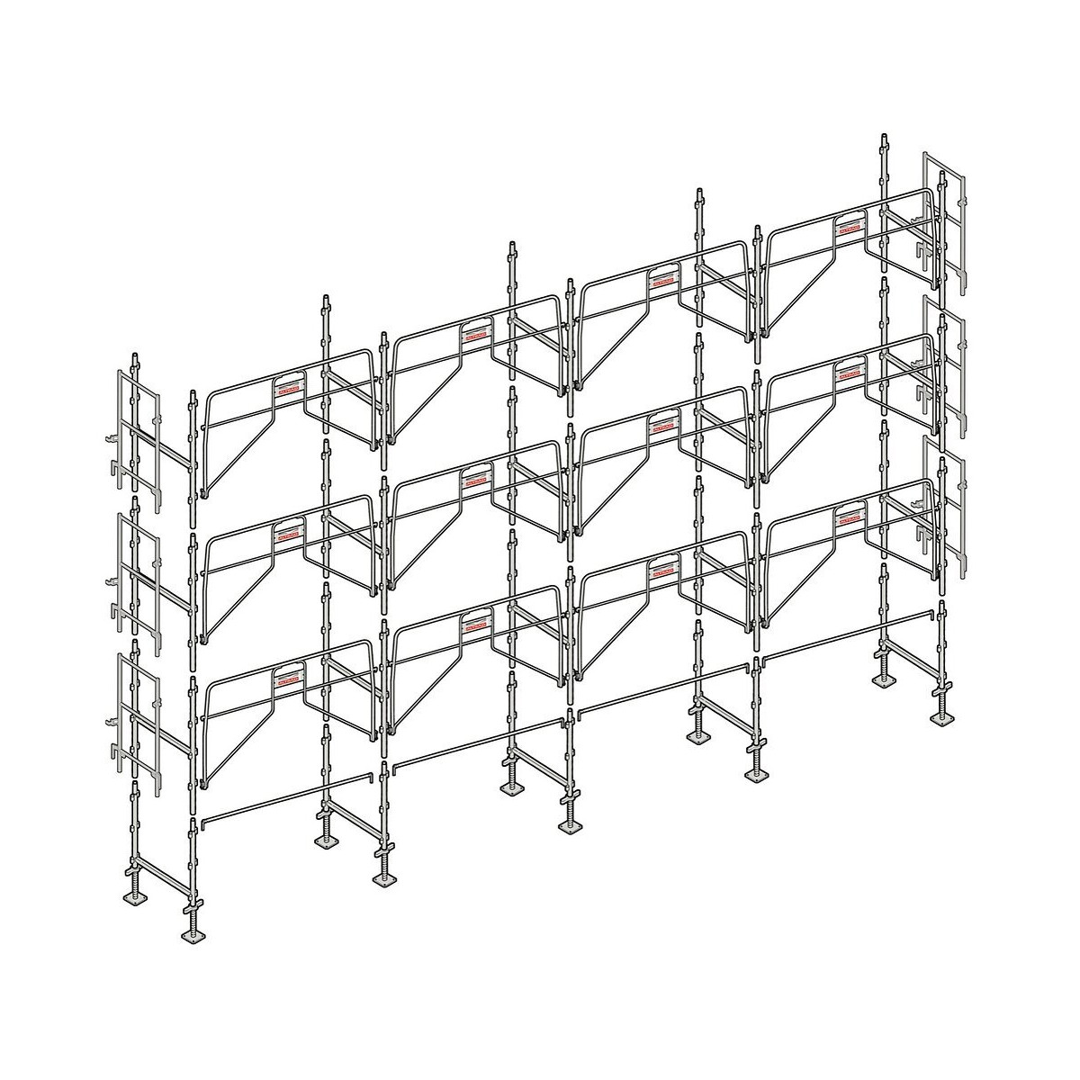 Échafaudage Façadier de 104 m² Cette gamme d'échafaudage galvanisé est robuste et très polyvalent idéal pour les travaux de peinture, ravalement, isolation, couverture, en neuf ou en rénovation et petite maçonnerie. Également apprécié pour sa rapidité au montage. Résistant, léger, longue durée de vie. Largeur : 0,80 m Longueur de travail : 13 m Hauteur de travail : 8 m Classe 4 (300 kg/m2). Montants des échelles diamètre 45 mm, épaisseur 2,2 mm. Nombre d'amarrages recommandés : 1 tous les 24 m² AGS104A : Structure avec Garde-corps sécurité au montage (sans plateau) Composition de l'échafaudage : - 10 vérins de niveau de 60 cm - 5 cadres de départ - 15 échelles de 2 m - 4 lisses de 3 m - 12 garde-corps de sécurité au montage MDS - 6 garde-corps d'extrémité MDS