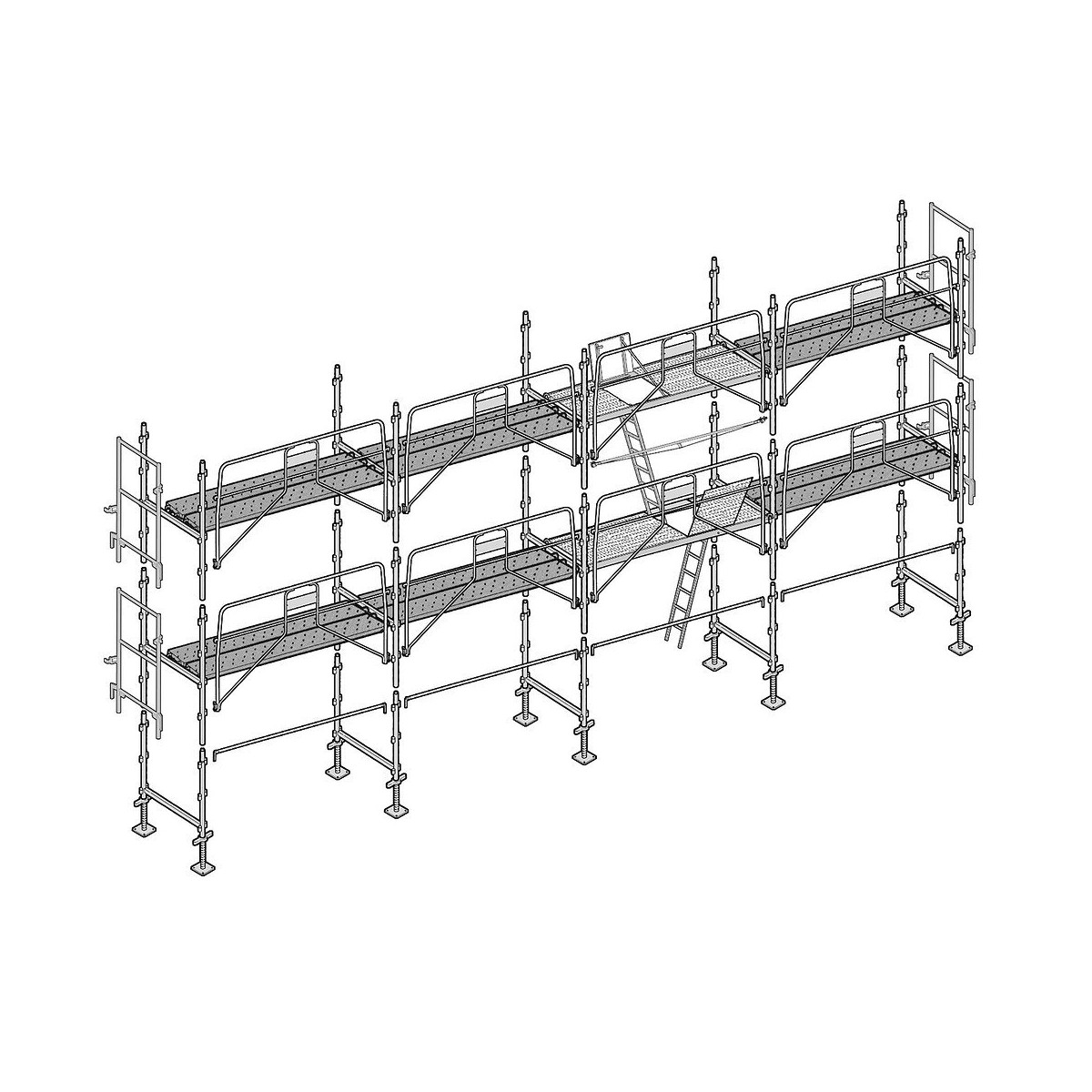 Échafaudage Façadier de 78 m². Cette gamme d'échafaudage galvanisé est adaptée aux travaux de peinture, ravalement, isolation,couverture, en neuf ou en rénovation. Apprécié pour sa rapidité au montage. Résistant, léger, longue durée de vie. Classe 4 (300 kg/m2) avec ses 2 planchers acier. Montants des échelles diamètre 45 mm, épaisseur 2,2 mm. Largeur : 0,80 m Longueur de travail : 13 m Hauteur de travail : 6 m Fabrication française Nombre d'amarrages recommandés : 1 tous les 24 m² AGSP78 : Échafaudage avec Garde-corps sécurité au montage + plateaux Composition de l'échafaudage : - 10 vérins de niveau de 60 cm - 5 cadres de départ - 10 échelles de 2 m - 4 lisses de 3 m - 8 gardes corps de sécurité au montage MDS - 4 gardes corps d'extrémité MDS Planchers : - 2 planchers trappe alu/bois de 3 m x 0,75 m - 2 échelles d'accès en acier - 12 planchers en acier de 3 m x 0,36 m - 1 lisse à collier de 3 m