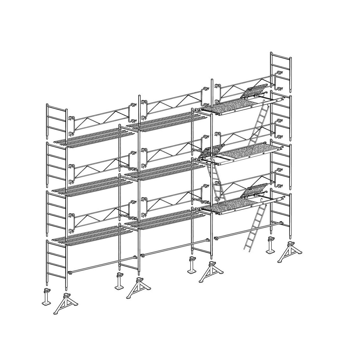 Échafaudage Altrad 49 maçon 80 m² Cette gamme d'échafaudage en acier galvanisé est conçu pour une bonne maniabilité et offre aux entreprises de gros oeuvre de nombreuses solutions de montage. Grâce à ses nombreux composants et leur système d'accrochage à 360°, tous les chantiers de maçonnerie et couverture, peuvent être géré sans difficulté. Largeur : 0,95 m Longueur de travail : 10 m Hauteur de travail : 8 m Classe 4 (300 kg/m2) Diamètre des montants de 48,3 mm, épaisseur 2,6 mm. TOP10x8cA Échafaudage complet (avec plateaux) Composition de l'échafaudage : - 4 pieds simple - 4 pieds fixe - 6 échelles 2 m sans barreau - 6 échelles 2 m / 4 barreaux - 2 échelles 1,50 m / 3 barreaux - 3 entretoises de montage de 3 m - 2 pilliers de faîte 1,20 m - 9 gardes corps fixe de 3 m Planchers : - 3 planchers alu/bois trappe 3 m * 0,85 m - 18 planchers acier 3 m * 0,30 m - 3 échelles d'accès en acier
