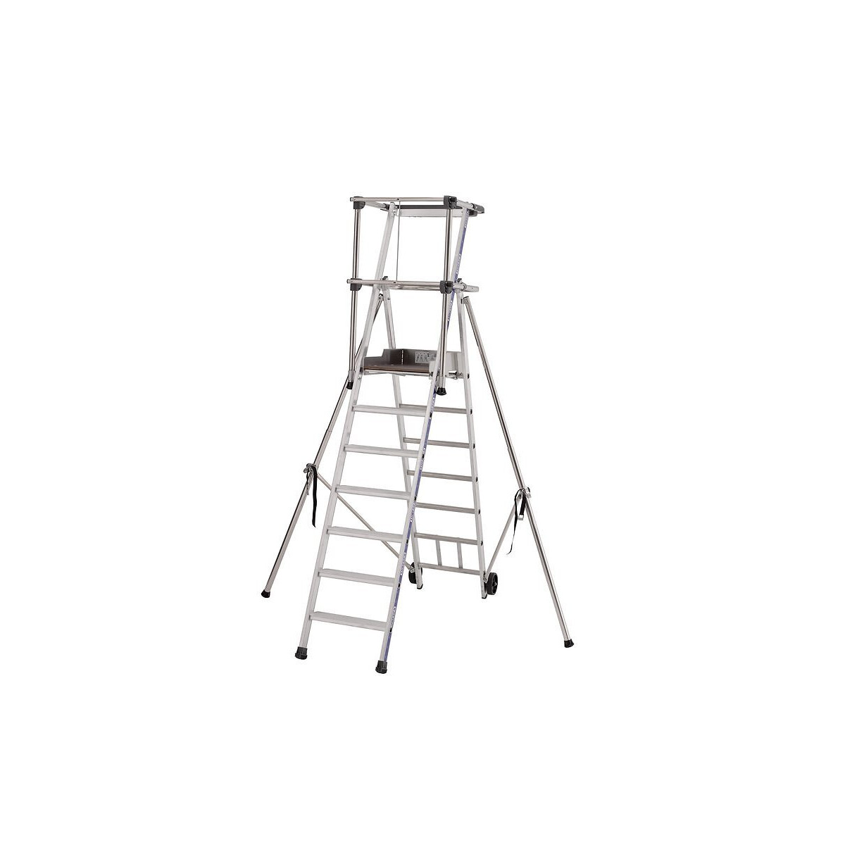 Caractéristiques techniques : Ceinture de sécurité semi-automatique rigide à 360°. Stabilisateurs avec réglage millimétrique breveté. Montants en U ultra-résistants Plate-forme antidérapante 600 x 420 mm avec plinthes intégrées (hauteur : 120 mm). Marches alu striées antidérapantes (largeur : 80 mm). Testé sous des charges intensives pour résister aux exigences des professionnels du bâtiment et de la maintenance.