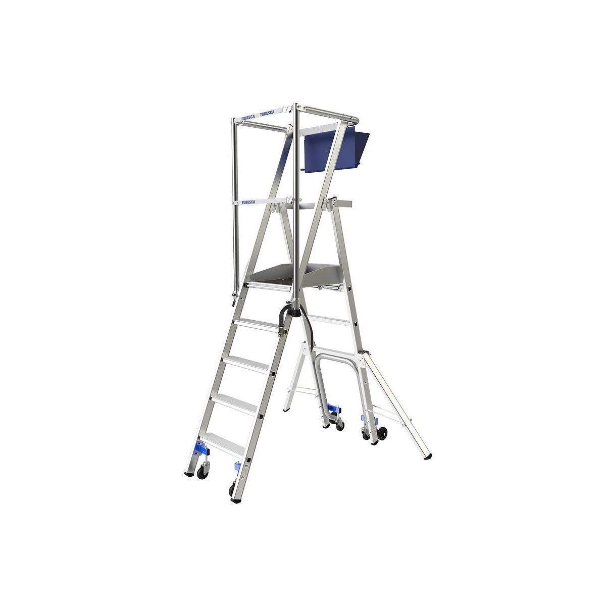 Caractéristiques techniques : Des roues escamotables Ø75 mm pour faciliter les déplacements déployés Garde-corps rigide 3 côtés avec sangles anti-chute arrière, avec mise en place semi-automatique Base(s) évasée pour une mise en place sans stabilisateur (sauf modèle 5 marches) Passage libre arrière pour se positionner dans les endroits encombrés (WC, gaines, rails...) Stabilisateurs indépendants repliables pour le modèle 5 marches Marches striées antidérapantes de 80 mm Plate-forme antidérapante 500 x 400 mm avec plinthes intégrées (hauteur : 100 mm) Large porte-outils en tissu multi-fonctions