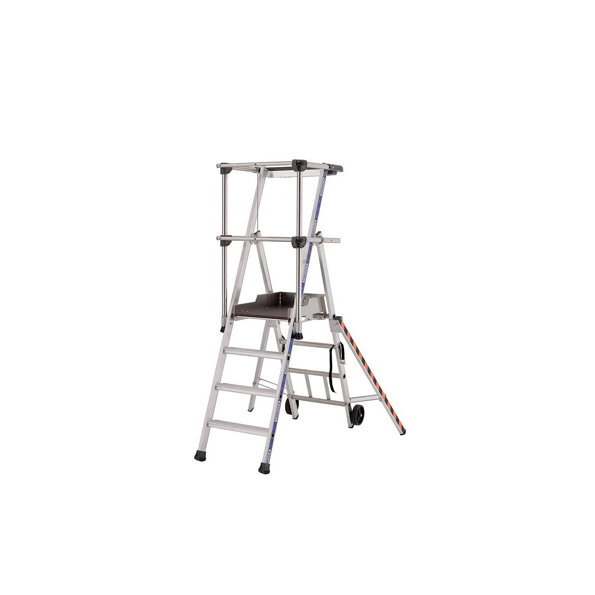 Caractéristiques techniques : Ceinture de sécurité semi-automatique rigide à 360°. Stabilisateurs avec réglage millimétrique breveté. Montants en U ultra-résistants Plate-forme antidérapante 600 x 420 mm avec plinthes intégrées (hauteur : 120 mm). Marches alu striées antidérapantes (largeur : 80 mm). Testé sous des charges intensives pour résister aux exigences des professionnels du bâtiment et de la maintenance.Spécifications techniques