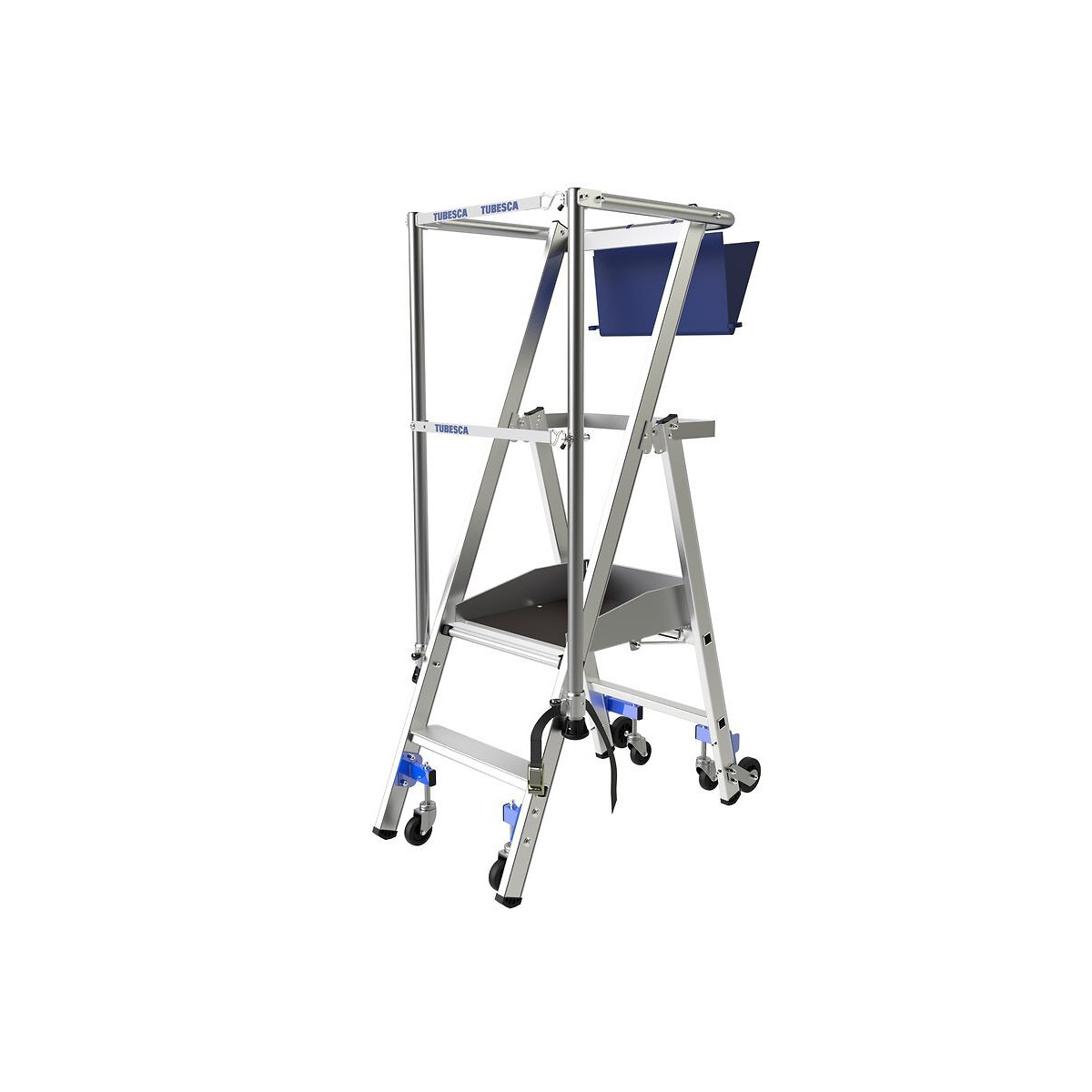 Caractéristiques techniques : Des roues escamotables Ø75 mm pour faciliter les déplacements déployés Garde-corps rigide 3 côtés avec sangles anti-chute arrière, avec mise en place semi-automatique Base(s) évasée pour une mise en place sans stabilisateur (sauf modèle 5 marches) Passage libre arrière pour se positionner dans les endroits encombrés (WC, gaines, rails...) Stabilisateurs indépendants repliables pour le modèle 5 marches Marches striées antidérapantes de 80 mm Plate-forme antidérapante 500 x 400 mm avec plinthes intégrées (hauteur : 100 mm) Large porte-outils en tissu multi-fonctions