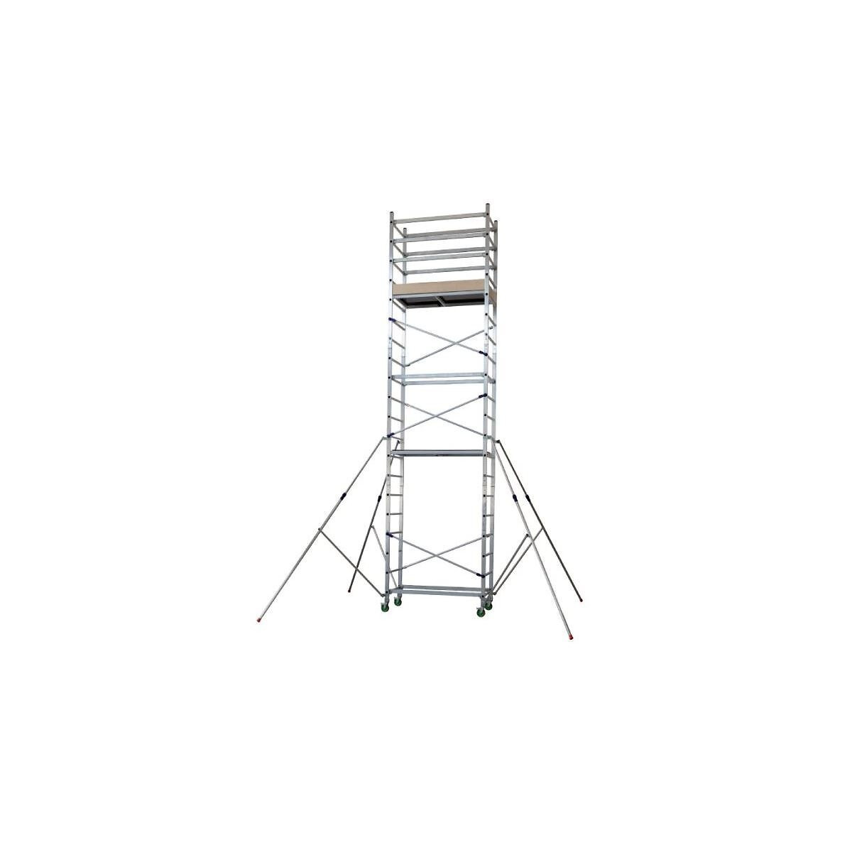 Le SUPREMALU est un échafaudage en aluminum muni de 4 roues avec freins ainsi que 4 stabilisateurs télescopiques. - Assemblage diagonales / montant très rapide grâce à un système de vérouillage à expension automatique. - Assemblage lisses / montant très résistante et facile grâce à des crochets de sécurité. Montage très rapide (Pas de pièces à monter). Hauteur d'accès avec opérateur : 6,90 m Hauteur plateau : 4,90 m Largeur : 1,53 mSpécifications techniques