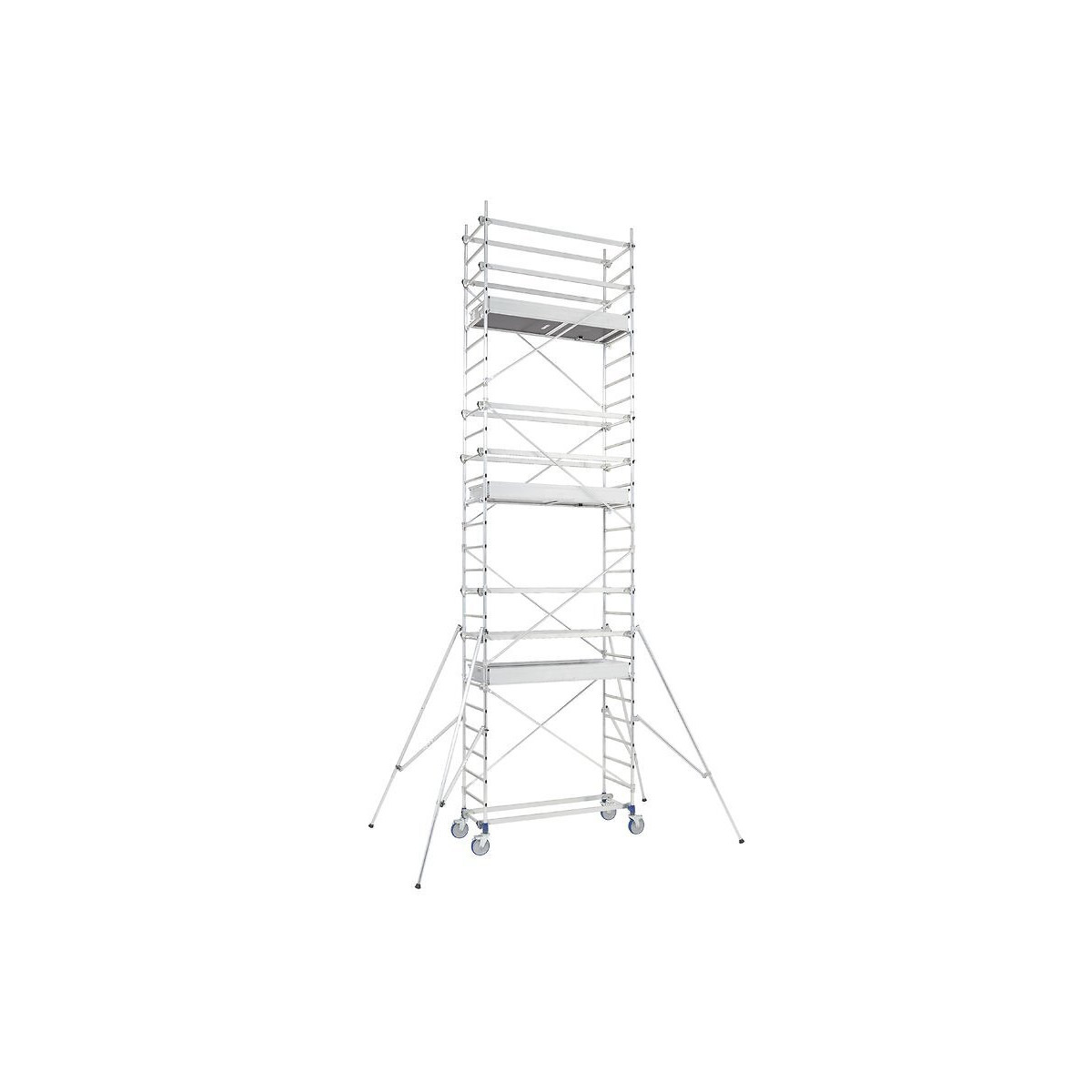 Caractéristiques techniques : Les extrémités des lisses et sous-lisses ont des mâchoires crantées qui se mettent en place automatiquement lors de la pose. Elles assurent une liaison anti-chute très fiable. Le plancher bac avec plinthes intégrées est apprécié des organismes de sécurité. Il garantit la sécurité et un montage rapide. Les planchers ont, sur les plinthes d'extrémités, des poignées de prise en main qui facilitent les transports et chargements. Les lisses rectangulaires se mettent en place et se retirent facilement grâce à la perche T-Grip. Chaque roue se règle en hauteur individuellement sur une course de 200 mm avec un réglage préprogrammé tous les 12,5 mm. Ce réglage permet de s'adapter à tous les sols. Les roues sont équipées d'un système de blocage bi-directionnel qui garantit une parfaite stabilité en utilisation. Les stabilisateurs se mettent en place grâce à des pièces techniques en aluminium. Le serrages'effectue avec des papillons imperdables.
