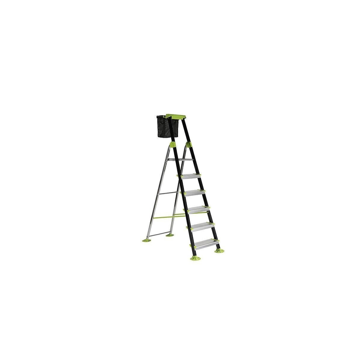 L'escabeau de jardin Garden Step est en aluminium. Grâce à ses sabots spécialement conçus pour l'extérieur, il ne s'enfonce pas dans la pelouse et reste stable dans les graviers. Marches : 6 Hauteur de travail : 1,22 m Hauteur de travail avec opérateur : 3,20 m Hauteur repliée : 1,98 m Ses larges marches sont confortables, il dispose d'un panier détachable permettant de faire la cueillette et d'une tablette porte-outils pensé pour contenir le nécessaire du jardinier. Des patins spécial extérieur qui peuvent se retirer facilement pour une utilisation de l'escabeau en intérieur.Spécifications techniques