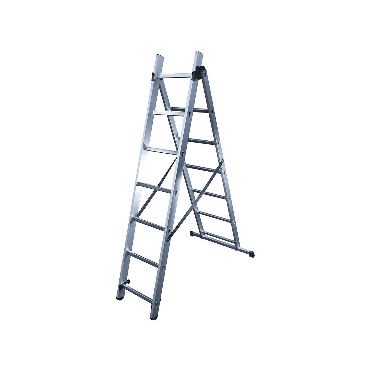 Echelle transformable en aluminium 2 plans. 2 x 7 échelons. Utilisable en échelle coulissante à main. Base rapportée pour plus de stabilité et une utilisation en toute sécurité.Spécifications techniques