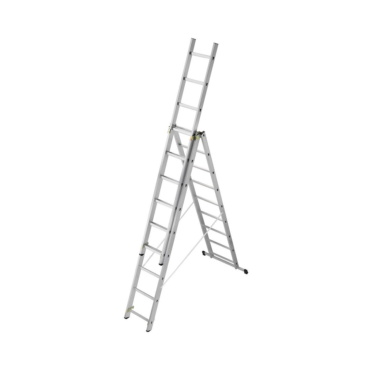 Echelle transformable en aluminium 3 plans. 3 x 9 échelons. Patins anti-dérapants pour une stabilité optimale. Base rapportée pour plus de stabilité et une utilisation en toute sécurité. Echelons sertis monoblocs Polyvalente :. Utilisable en échelle double, coulissante ou simple avec crochet et sangles de sécurité.Spécifications techniques