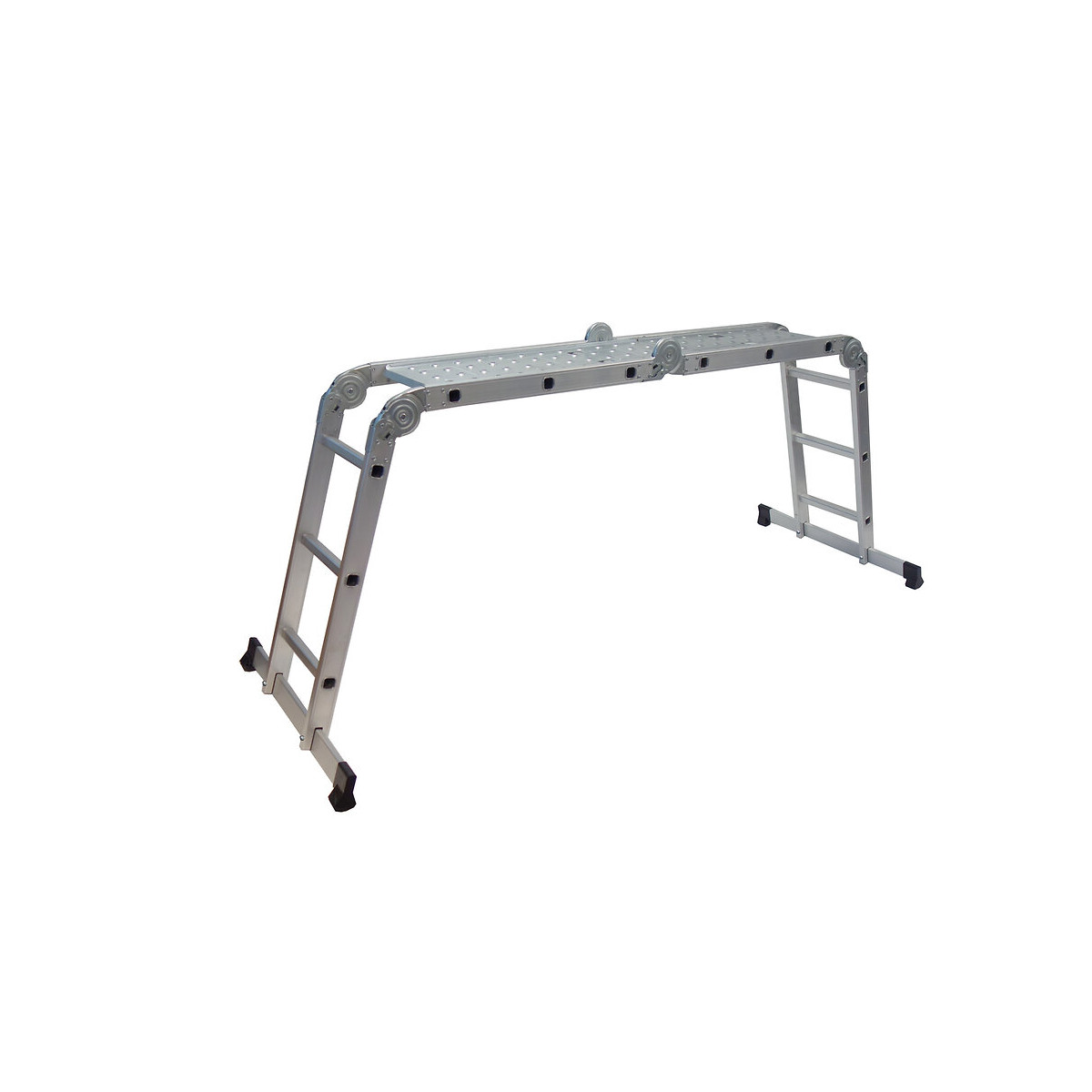 Échelle articulée multi-positions, en aluminium. 4 éléments de 3 barreaux. Équipée de 2 stabilisateurs en aluminium. Charge maximale utilisation 150 kg. Positions plateforme, échelle d'appui, écarteur de mur et échelle double. Un encombrement réduit et des articulations avec blocage automatique dans les différentes positions d?utilisation.Spécifications techniques