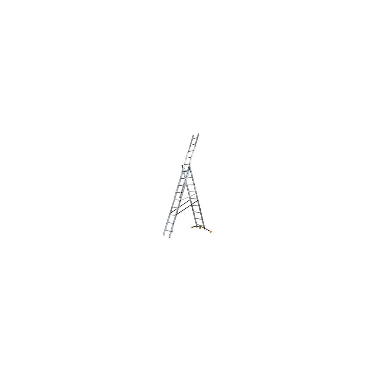 Echelle transformable 3 plans. 3 x 9 échelons. Utilisable en échelle simple, double et coulissante. Echelons striés sur les 4 faces antidérapants pour plus de confort et de sécurité. "Lot-Systeme" innovant de compensation des inégalités du sol jusqu'à 15cm. Rattrapage de niveau dans les escaliers. Large base rapportée incurvée. Crochet de verrouillage de sécurité.Spécifications techniques