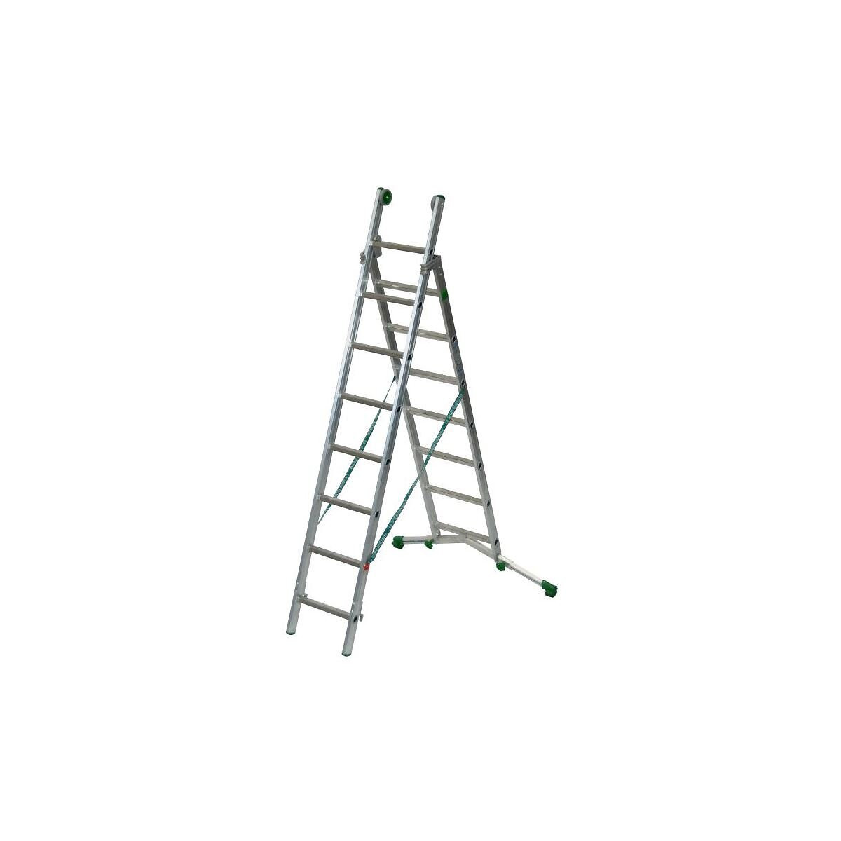 Échelle Haut de gamme, avec rattrapage de niveau, possédant une barre stabilisatrice télescopique de 83 à 128 cm. Marches : 7+8 Longueur déplier : 4,20 m Hauteur d'accès avec opérateur : 5,10 m Hauteur en Escabeau avec opérateur : 3,70 m Dimension replier : 2,64 m Verrouillage automatique anti-défilement. Large roulettes diamètre 100. Bras de sécurité aluminium pour maintenir l'échelle ouverte. Échelon incliné pour un meilleur confort. Articulation en fonderie d'aluminium recouvert de nylon pour la glissière. Échelle en aluminium transformable. Capable d'être toujours en conditions de parfaite stabilité. En mesure de s'adapter à des situations de travail désavantageuses, même en présence de marches, d'inclinaisons, de fausses surfaces planes. Barres stabilisatrices réglables. Cette échelle est la première à garantir la solidité et la sécurité des traditionnelles échelles, avec l'esprit universel et les avantages offerts seulement par les télescopiques multi-usages.