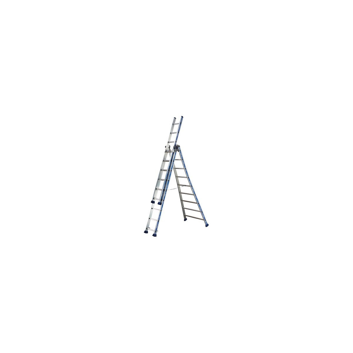 L'échelle Platinium transformable 3 plans en aluminium dispose d'une base évasée pour une stabilité maximum, de sabots enveloppants haute sécurité et d'une articulation brevetée. Elle garantit résistance, polyvalence et sécurité à tous ses utilisateurs. - Montants à profil renforcé contre les chocs. - Glissière en aluminium inoxydable avec patin de glissement intégré pour un grand confort de guidage. Marches : 3x8 Longueur déplier : 5,17 m Hauteur d'accès avec opérateur : 6,08 m Hauteur en Escabeau : 3,69 m Hauteur en Escabeau avec opérateur : 4,61 m Dimension replier : 2,37 m