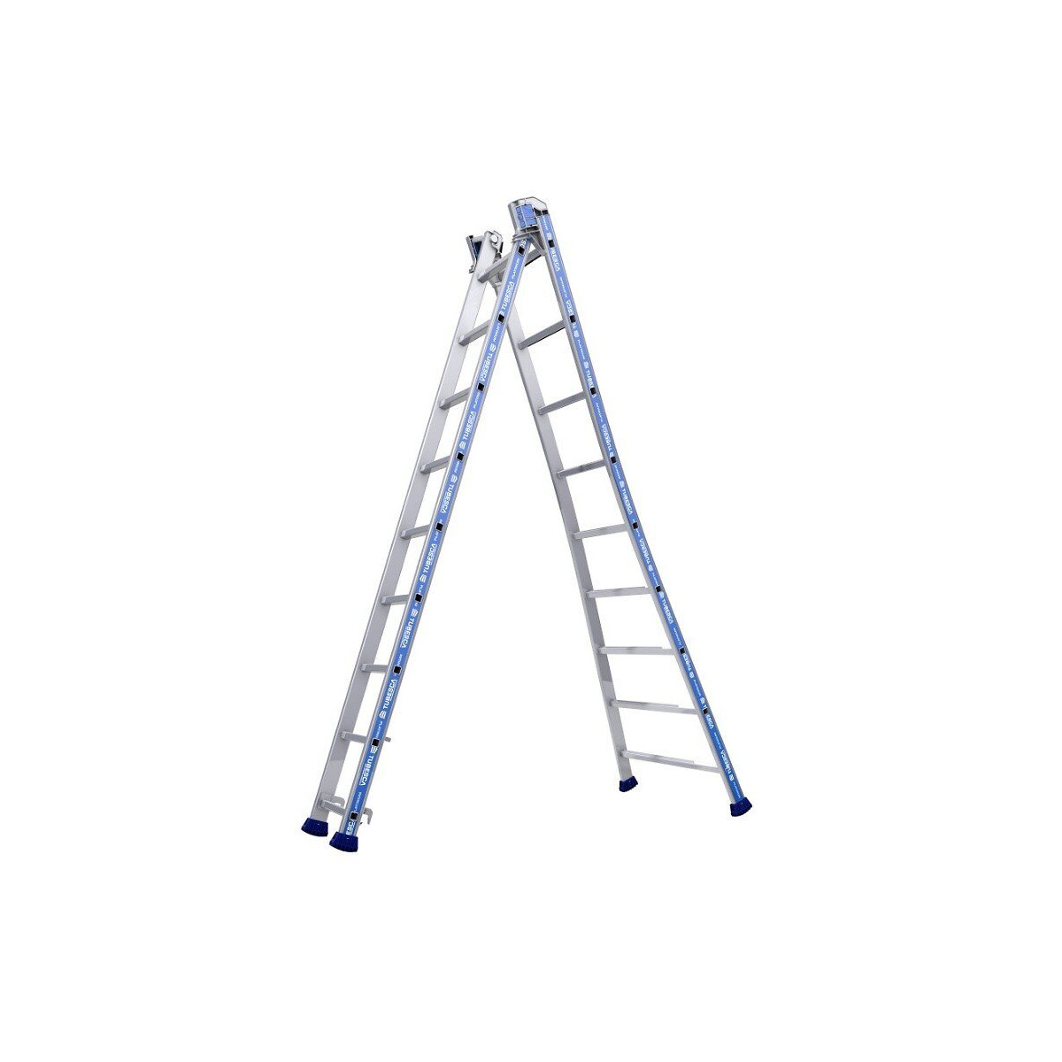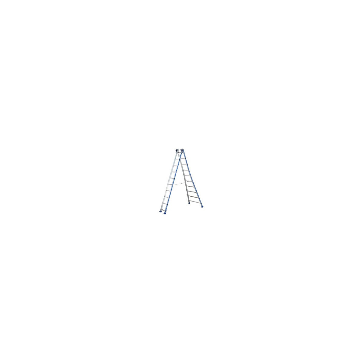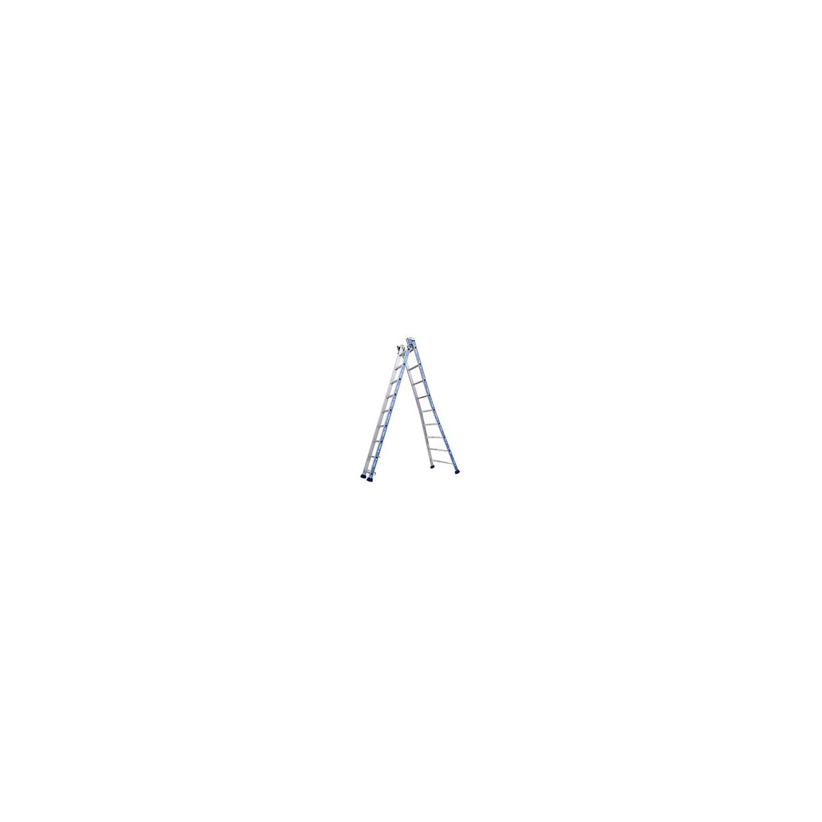 L'échelle Platinium transformable 2 plans en aluminium dispose d'une base évasée, de sabots enveloppants haute sécurité et d'une articulation. Elle garantit résistance, polyvalence et sécurité à tous ses utilisateurs. - Profils renforcés pour plus de stabilité et de durabilité. - Sangle amovible pour passage libre. Marches : 2x9 Longueur dépliée : 4,60 m Hauteur d'accès avec opérateur : 5,50 m Hauteur en Escabeau avec opérateur : 3,54 m Largeur ouverture Escabeau : 1,85 m Dimension replier : 2,64 m