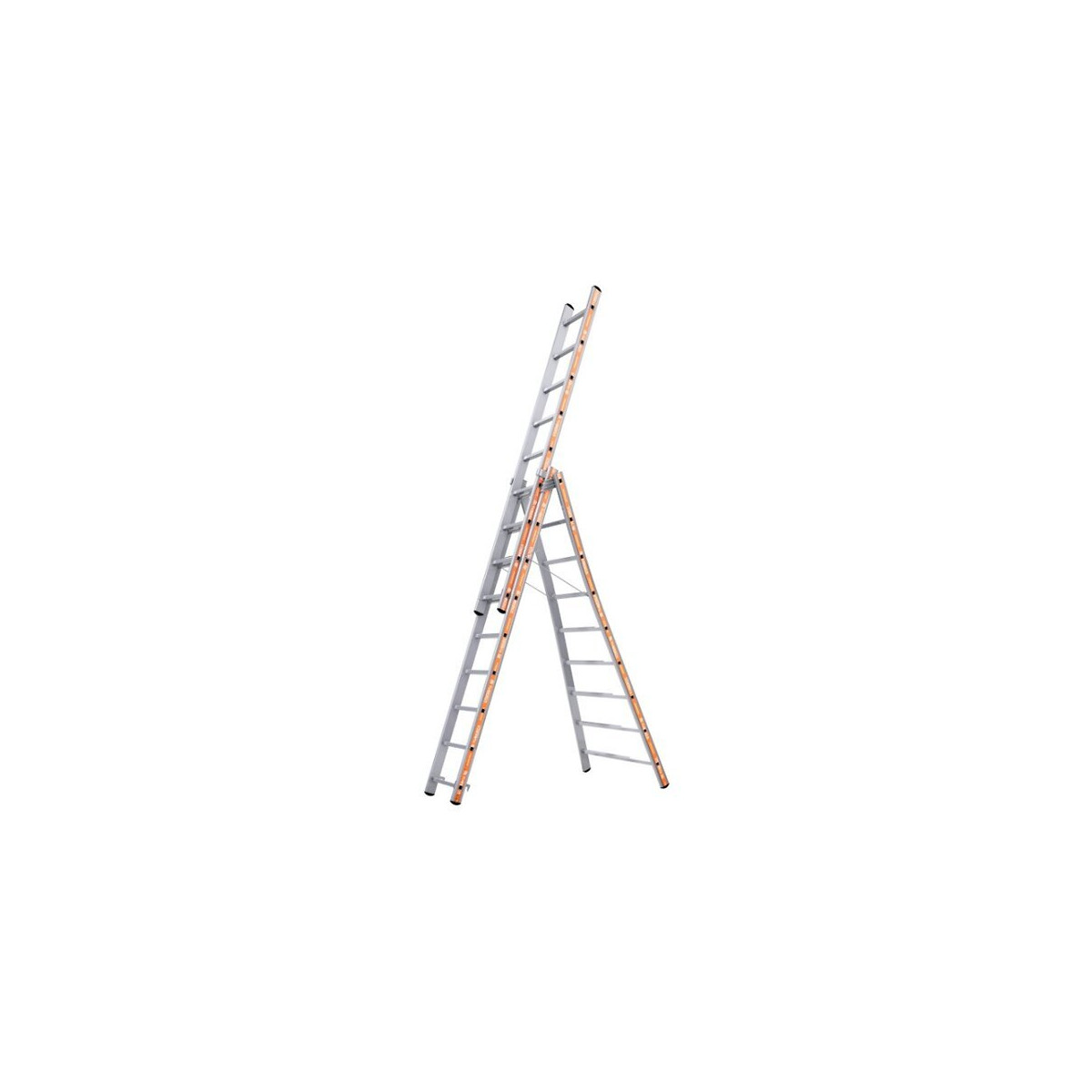 L'échelle Pronor transformable 3 plans en aluminium dispose d'articulations en fonderie d'alu, d'une base évasée et d'un bras anti-écartement en acier. Ces derniers garantissent fiabilité et confort à tous les utilisateurs. Marches : 3x9 Longueur dépliée : 5,97 m Hauteur d'accès avec opérateur : 6,87 m Hauteur en Escabeau : 4,21 m Hauteur en Escabeau avec opérateur : 5,11 m Dimension replier : 2,61 m - Le modèle le plus polyvalent de la gamme Pronor. - Rigidité extrême avec une articulation nervurée renforcée en aluminium moulé et un bras rigide anti-écartement. - Légère et maniable pour une mise en place et un transport facilité.