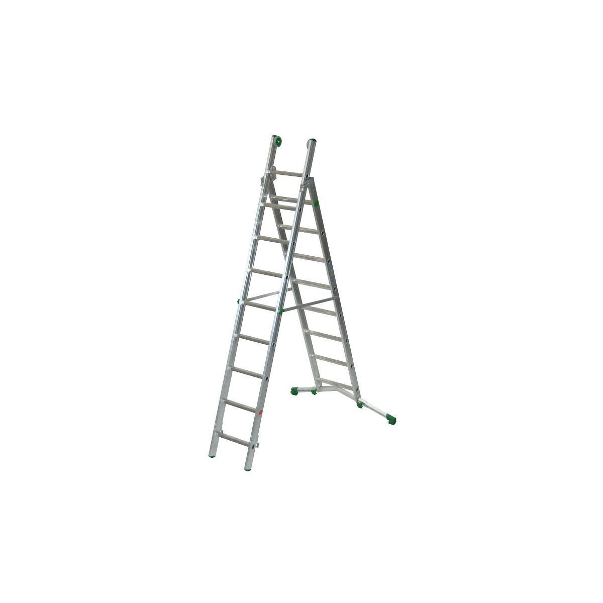 Échelle Haut de gamme, avec rattrapage de niveau, possédant une barre stabilisatrice télescopique de 83 à 128 cm. Marches : 8+9 Longueur déplier : 4,80 m Hauteur d'accès avec opérateur : 5,70 m Hauteur en Escabeau avec opérateur : 4 m Dimension replier : 2,94 m Verrouillage automatique anti-défilement. Large roulettes diamètre 100. Bras de sécurité aluminium pour maintenir l'échelle ouverte. Échelon incliné pour un meilleur confort. Articulation en fonderie d'aluminium recouvert de nylon pour la glissière. Échelle en aluminium transformable. Capable d'être toujours en conditions de parfaite stabilité. En mesure de s'adapter à des situations de travail désavantageuses, même en présence de marches, d'inclinaisons, de fausses surfaces planes. Barres stabilisatrices réglables. Cette échelle est la première à garantir la solidité et la sécurité des traditionnelles échelles, avec l'esprit universel et les avantages offerts seulement par les télescopiques multi-usages.