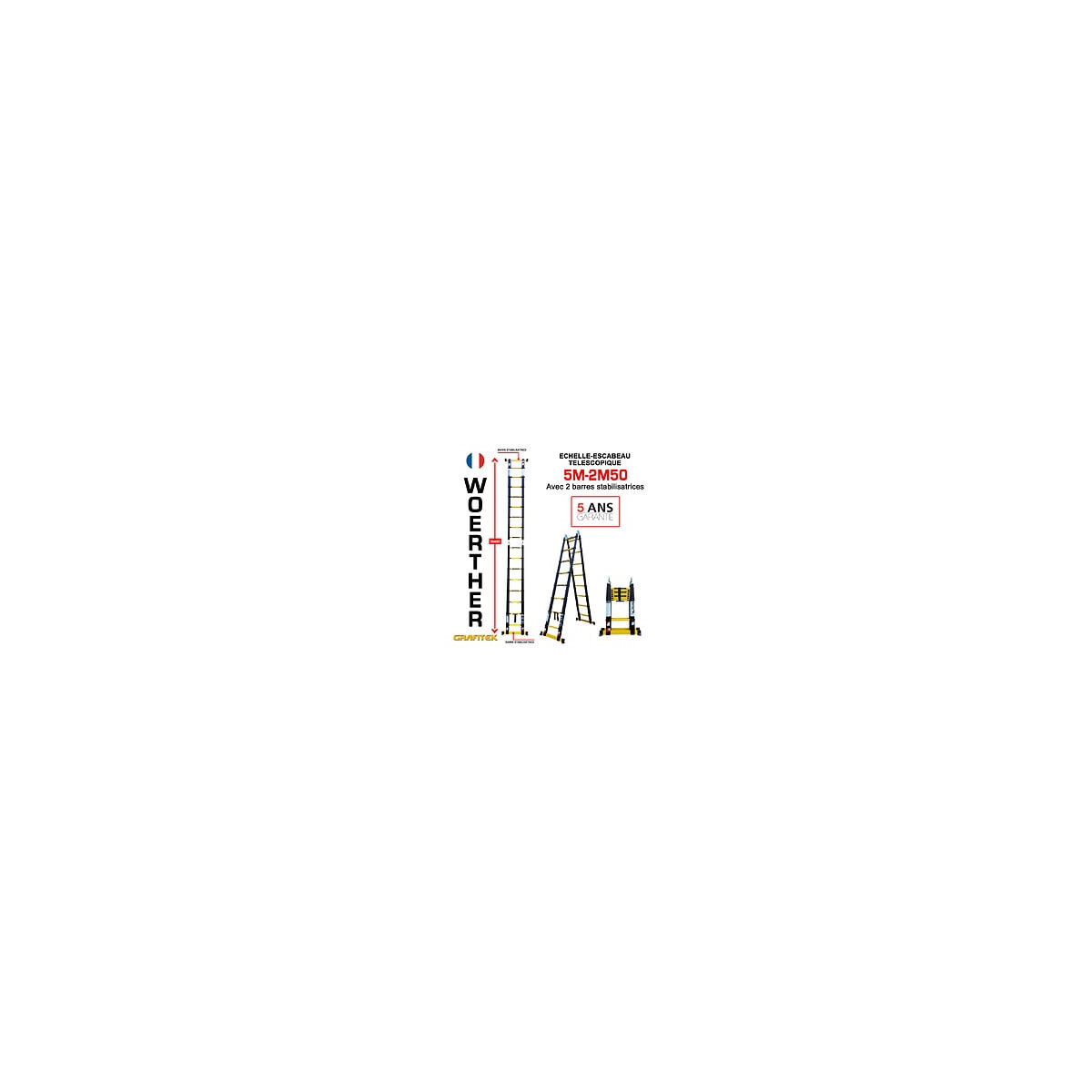 Découvrez le modèle ESCABEAU TELESCOPIQUE 5M - WOERTHER - GAMME PRO GRAFITEK pour tous vos travaux de bricolage, aussi bien pour les particuliers que les professionnels. Avec le composant graphite, l'échelle télescopique Woerther devient l'une des meilleures du marché ! Découvrez tous les avantages du graphite en cliquant sur le lien suivant : >> Pourquoi utiliser le graphite sur nos échelles télescopiques Woerther ? Avec sa garantie de 5 ans, elle est fournie avec sa barre stabilisatrice pour une meilleure sécurité au niveau du sol. Equipé du double système "Push & Go", cet escabeau télescopique renforce votre sécurité à l'aide de boutons poussoirs pour éviter les pincements de doigts et permet une meilleure répartition de la charge du corps en offrant une stabilité accrue avec ses embouts antidérapants. - Fonction échelle pliante : hauteur modulable de 250 à - 500 cm - Fonction escabeau : 250 cm - Finitions composées de graphite - Verrouillage des paliers : automatique - Normes européennes : EN-131-1, EN-131-2,EN-131-3 et EN-131-6 - Lanière de fermeture - Charge nominale : 150 kg - Poids : 15,2 kg GARANTIE 5 ANSSpécifications techniques