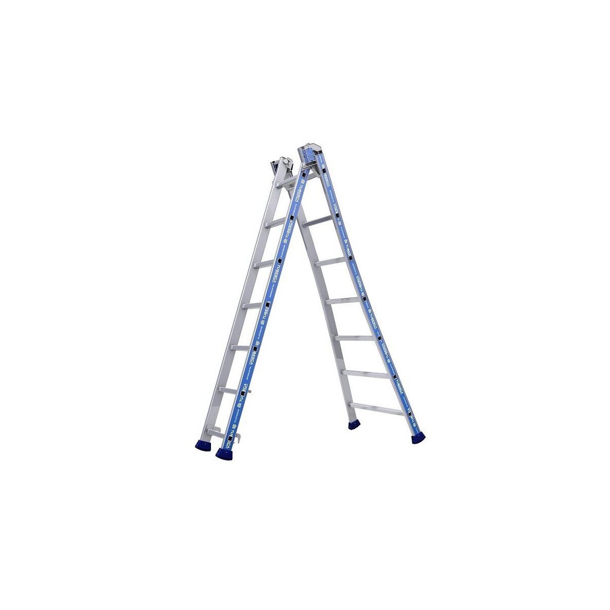L'échelle Platinium transformable 2 plans en aluminium dispose d'une base évasée, de sabots enveloppants haute sécurité et d'une articulation. Elle garantit résistance, polyvalence et sécurité à tous ses utilisateurs. - Profils renforcés pour plus de stabilité et de durabilité. - Sangle amovible pour passage libre. Marches : 2x7 Longueur dépliée : 3,48 m Hauteur d'accès avec opérateur : 4,38 m Hauteur en Escabeau avec opérateur : 2,98 m Dimension replier : 2,08 m