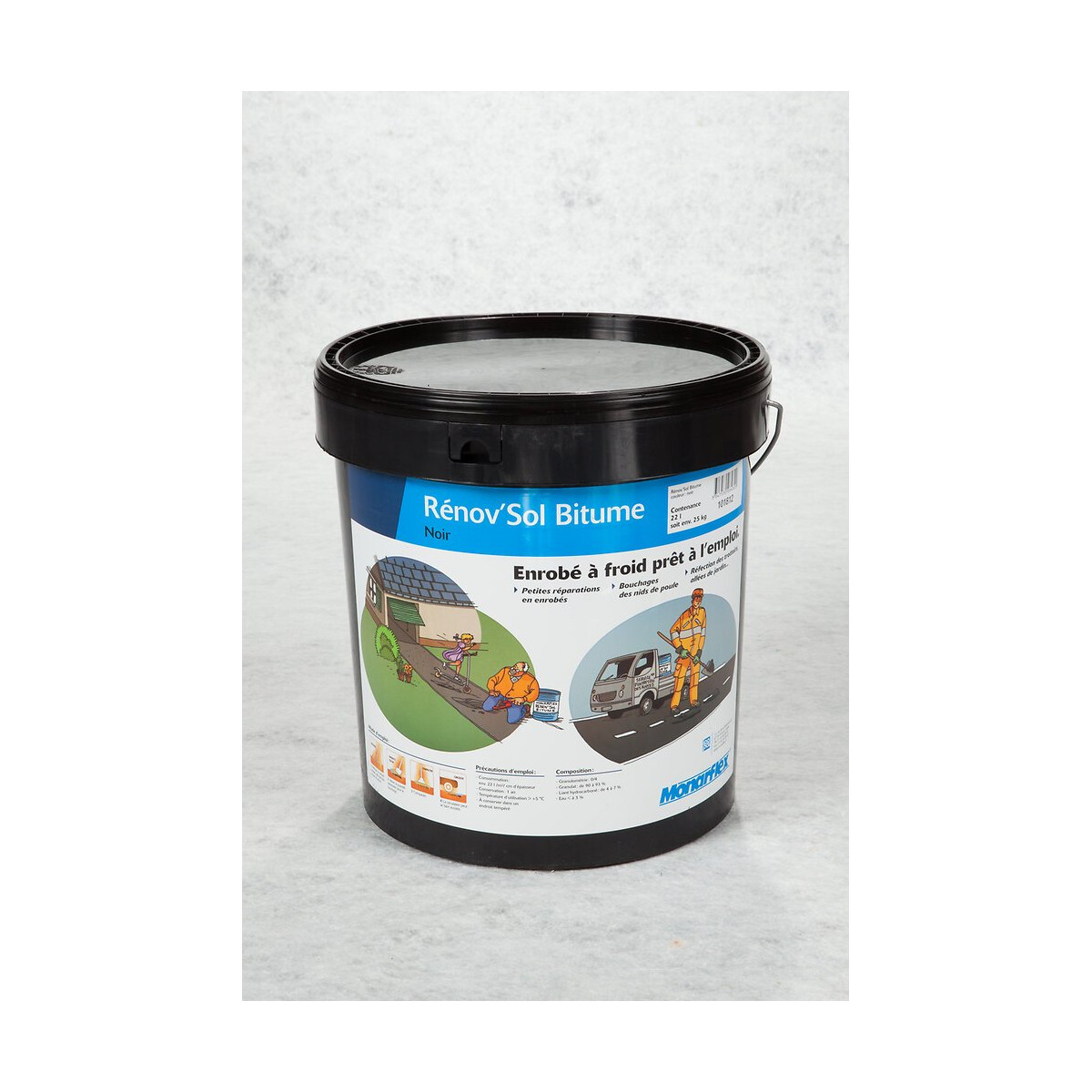 Pour petites réparations d'enrobé, nids de poule, allées. Granulométrie de 0/4 Prêt à l'emploi Bithume de couleur noir Mise en oeuvre manuellement sans outil spécialisé Seau de 25 kg.