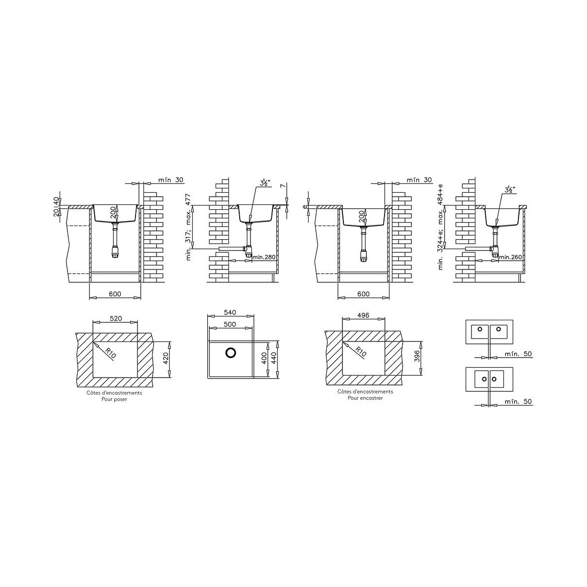 L'évier robuste et design par excellence ! Le Sierra 1 cuve en résine, résiste à des températures jusqu'à 230° pour une utilisation optimale sans craintes de marques sur votre évier. Il est également résistant aux chocs, ce qui en fait un évier à la fois design et fonctionnel. DESIGN : - Evier 1 cuve . - Matière en Résine noire. CARACTERISTIQUES : - Bonde à panier de 90mm pour filtrer les résidus. - Siphon avec raccord pour lave-vaisselle et machine à laver inclus. - Cuve encastrable ou à poser dans un caisson de 60cm de largeur minimum. - Pattes de fixations non incluses. - Notice d'installation incluse dans l'emballage. - Vidage standard et trop plein inclus COMPOSITION : - La résine est un combiné de fibre de verre et de résine de synthèse résistant fortement aux chocs. - Peut subir des températures jusqu’à 230°c sans marquer. - Sa légèreté en fait un évier facile à poser. GARANTIE : - Evier : 15 ans. - Pièces détachées : Pas de garantie. DIMENSIONS: Longueur (mm) Largeur (mm) Profondeur (mm) 540 440 200 - Côtes d'encastrements pour encastrer (en cm) : 49,6 L x 39,6 H - Côtes d'encastrements pour poser (en cm) : 52 L x 42 H - Dimensions de la cuve ( en cm) : 50 L x 40 l x 20 P - Diamètre évacuation : 90mm Conseils d'entretien : - Il est conseillé de nettoyer le produit avec une solution savonneuse (type liquide vaiselle), ne jamais utiliser de substances acides ou abrasives. Les taches de calcaire peuvent être évitées en séchant la robinetterie après son utilisation. - Rincer à l'eau claire - Utiliser un chiffon doux - Eviter d'utiliser des produits abrasifs: détergent et solvants - Pour éviter les obstructions dues au calcaire il est conseillé d'utiliser de l’eau chaude avec du vinaigre blanc. - si les taches peristes vous pouvez utiliser une éponge et de la crème à récurer.Spécifications techniques