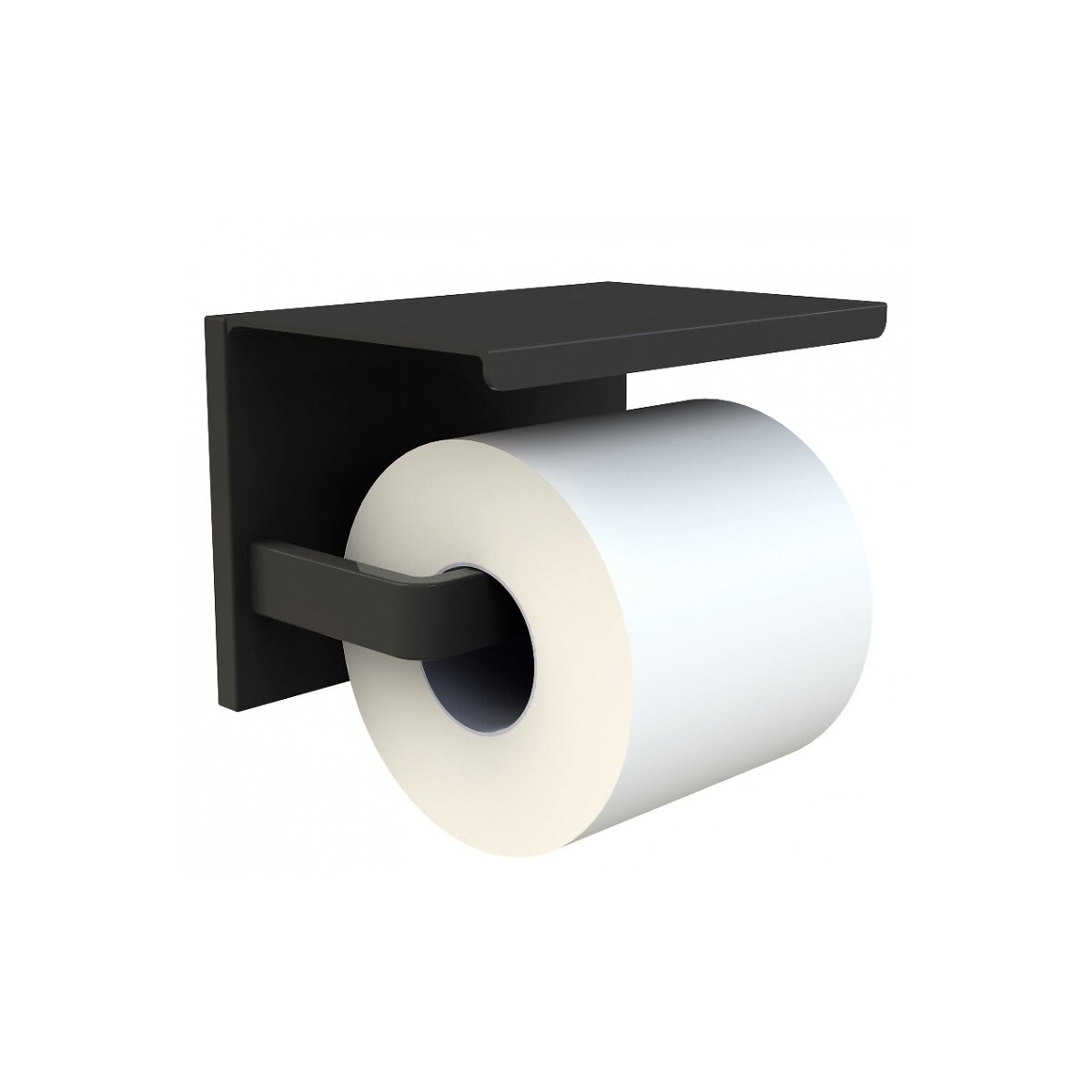 Distributeur de papier wc avec étagère pour poser son portable, portefeuille,... Dimensions: 16 x 11 x 11 cm Couleur: Noir mat Matière : Structure en Alu Laqué mat
