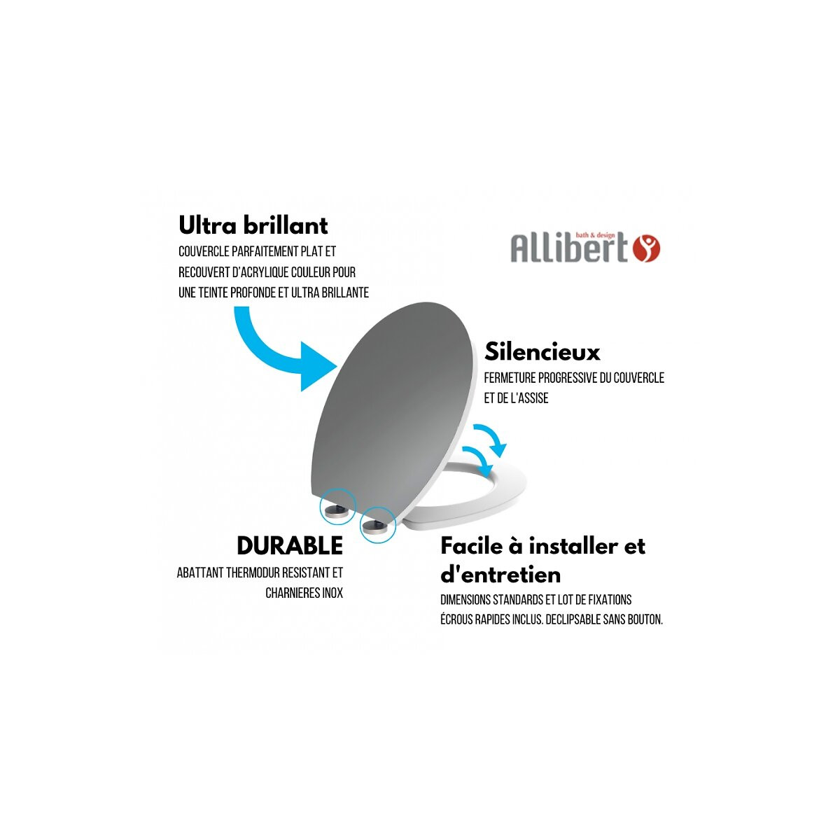 Qualité, tendance et ultra brillant Faites le choix d'un abattant coloris gris pour parfaire votre installation ! Coloris ultra brillant - Couvercle parfaitement plat et recouvert d'acrylique couleur gris pour une teinte profonde et ultra brillante Résistant - Abattant de type Thermodur facile d'entretien et résistant à l'humidité ! Silencieux - Fermeture progressive du couvercle et de l'assise avec son système Soft Close (frein de chute) Durable - Abattant résistant. - Charnières inox. Facile d'entretien - Déclipsable sans bouton pour un nettoyage facile et rapide ! Facile à installer - Dimensions standards (compatible avec les cuvettes standards). - Lot de fixations écrous rapides inclus. Coloris Assorti au meuble lave mains Porto gris 163151. Abattant garantie 5 ans. Dimensions : Largeur : 38 Cm. Hauteur : 6 Cm. Profondeur : 43,5 Cm.Spécifications techniques