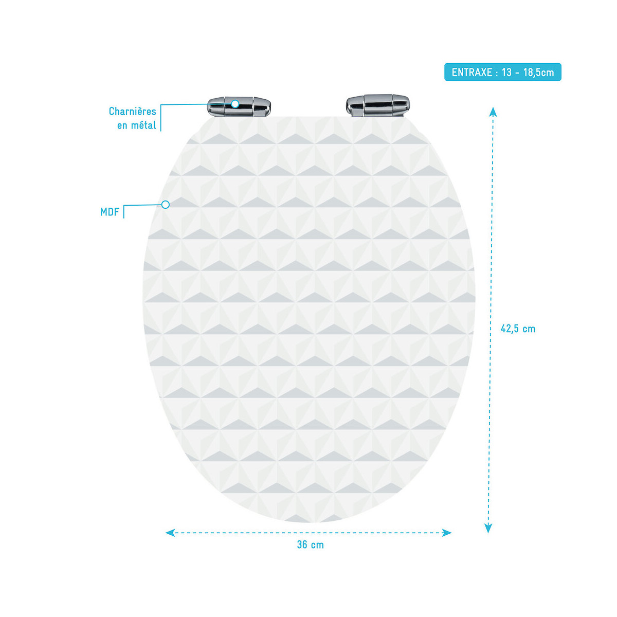 Abattant pour WC Blanc à reliefs Caractéristique de l'abattant : Double frein de chute Matière : MDF ( Panneau de fibres de bois de densité moyenne) Charnières en métal réglables Dimension de l'abattant : Largeur : 36 cm Longueur : 42,5 cm Entraxe : 13 - 18,5 cm Réference du produit: 700604 Désignation du produit: PYRAMID Garantie 2 ans pièces et non main d'oeuvre. Profilé noir mat thermolaqué : Le thermolaquage est une technique de traitement spécifique réservé aux matériaux en métal ou en aluminium brut. On projette de la peinture en poudre chargée en électricité statique qui va se déposer sur toute la surface des profilés. Cette technique de pulvérisation en poudre , qui s’appelle projection électrostatique ou poudrage électrostatique, permet d'avoir un revêtement complètement uniforme sur tous les profilés. Ce type de traitement dispense l’utilisation de produits chimiques nocifs pour la santé et l’environnement comme les solvants. Après avoir été recouverte de poudre, la pièce doit passer dans un four où elle sera chauffée pendant 20 minutes à 200°C. Les avantages du thermolaquage : Cette technique possède de nombreux avantage, qui sont La surface peinte possède une dureté supérieure ce qui a pour conséquence une résistance aux chocs accrue Le thermolaquage a une meilleure résistance à la corrosion La couleur des profilés thermolaqués résiste mieux au vieillisement et tout autres élément tel que l'humidité etc. Les profilés thermolaqués présentent une meilleure finition, fini les coulures de peinture et défauts d'aspect, avec cette technique la surface est uniforme Sans solvant c'est un véritable plus pour la santé Mais aussi plus écologique (pas de solvants) Dans un souci de qualité mais aussi de sécurité nos produits répondent à toutes les normes Européennes en vigeur. Que ce soit en terme de sécurité en cas de casse, d'entretien de nos produits ou de la durée de vie de ces derniers, nos produits remplissent tous les critères. Verre trempé : Le verre trempé est un verre qui a subi un traitement afin d’améliorer ses propriétés. Nous utilisons la trempe thermique qui consiste à porter le verre à très haute température (environ à 700 °C), puis de le refroidir rapidement. Ce processus favorise l'apparition de tensions en profondeur et celle de la compression à la surface du verre. Tout cela a pour effet l’amélioration de sa résistance aux chocs. Il est de 2 à 5 fois plus résistant que le verre simple. Mais aussi diminue grandement la dangerosité du verre car en cas de casse le verre explose en de petits morceaux et non pas en de grands pans tranchants. Pour le reste il conserve les mêmes propriétés que le verre classique Norme harmonisée : EN14428:2004 Certification Européenne: Aptitude au nettoyage : EN14428 :2004+A1:2008 Clause 4.2 Résistance à l’impact / Propriétés d’éclatement: EN14428:2004+A1:2008 Clause 4.3 Durabilité : EN14428:2004+A1:2008 Clause 4.4 MyShowerRoom c’est aussi la garantie de durabilité : Nous garantissons un stocks de pièces détachées d’au moins 5 ans Notre visserie est en acier inoxydable ce qui est une garantie anticorrosion Garantie 2 ans pièces uniquement Cocorico ! MyShowerRoom est une entreprise Française et toute la conception de nos produits est également Française. Ce qui est un véritable plus pour être au plus près de ses clients et avoir une meilleure connaissance de leurs attentes. Qui sommes nous L’HISTOIRE DE MYSHOWERROOM Nous avons créé MyShowerRoom en 2003 avec l’ambition de démocratiser le design et l’innovation dans la salle de bain pour faire de cette pièce un lieu à part entière, un véritable lieu d’histoires à vivre pour toute la famille. Nos cabines de douche et meubles de salle de bain dans l’ère du temps à des tarifs très accessibles. Nos nombreux brevets garantissent l’originalité de notre gamme de cabines de douches. Et nos ingénieurs mettent en œuvre tout leur savoir-faire et toutes les technologies innovantes au service d’une simplicité d’installation et d’utilisation incomparable pour tous. ÊTRE BIENVEILLANT AVEC NOS CLIENTS Notre service client a un objectif : rendre nos clients heureux. Pour cela nous veillons à répondre dans les 24h aux demandes clients. Mais aussi de toujours apporter une solution et entière satisfaction à nos clients. CONSTRUIRE DES PRODUITS TOUJOURS PLUS PERFORMANTS Nos ingénieurs, ainsi que nos équipes terrain consacrent tous leurs efforts à créer des produits adaptés à vos besoins, et toujours plus innovants grâce à nos technologies. Notre objectif est d’être votre unique interlocuteur pour tous vos projets de salle de bain. CONCRÉTISER LES RÊVES DE CHACUN Un projet de salle de bain ? Nous le réalisons ! Lieu de détente et de relaxation par excellence, la salle de bain est une des pièces maîtresse de la maison. Chez MyShowerRoom, nous mettons tout en oeuvre afin que ce rêve devienne réalité. PROPOSER UNE GAMME COMPLÈTE DE PRODUITS Nous vous proposons grâce à notre boutique en ligne une gamme complète de produits Made in MyShowerRoom pour équiper, et accessoiriser votre salle de bain. Un catalogue que nous renouvelons régulièrement avec les dernières technologies MyShowerRoom. APPORTER UNE EXPERTISE HUMAINE Parce que l’humain passe avant tout, nous travaillons avec les meilleurs experts. La satisfaction de nos clients est notre seule et unique priorité. Chaque problème a une solution, et c’est dans cette optique que nous avons mis en place un chat pour échanger directement avec nos équipes. NOTRE CENTRE LOGISTIQUE 11 000 m² d’entrepôt 7000 palettes en stock 1 800 colis traités par jour Plus de 260 préparations de commandes quotidiennes 12 quais de chargement/déchargement CONSEILS & VENTES Une équipe disponible 5 jours sur 7 pour vous accompagner dans vos achats. LIVRAISON GRATUITE Pour toute commande sur le 