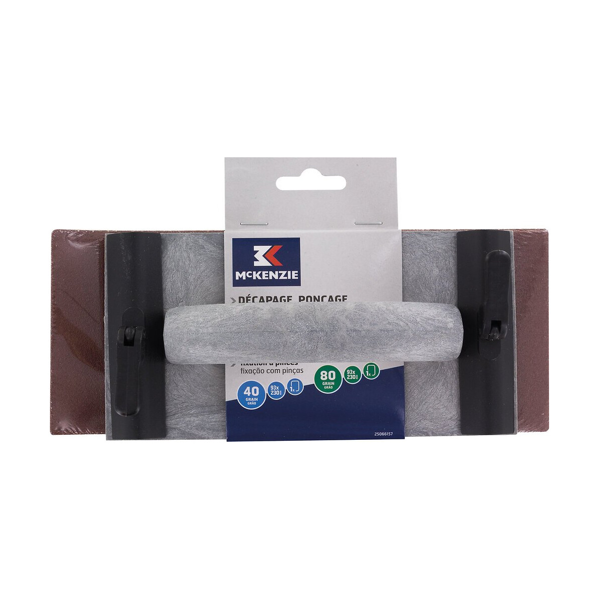 Cale de ponçage avec poignée 93x185mm, fixation à pinces, pour décapage et ponçage. Avec une bande grain 40 et une bande grain 80.