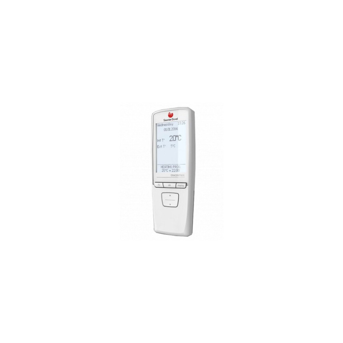 Thermostat d'ambiance sans fil SAUNIER DUVAL EXACONTROL E7RB-B programmation hebdomadaire (Condensation). Compatible chaudière Saunier Duval Isotwin condens,Isotwin,Isofast 21condens, thema condens, themaplus condens. Large écran LCD pour un affichage permanent de l'état de fonctionnement. Alimentation directe par la carte de la chaudière. Fonction éco et fonction vacances, pratique lors de vos absences : le mode de fonctionnement de l'appareil est désactivé pendant cette période. Réglage de la température d'eau chaude sanitaire. Réglage différent en fonction des jours de la semaine. Fourni avec le récépteur radio alimenté par la chaudière. L'émetteur peut être installé dans la pièce de votre choix puisqu'il est alimenté par piles et communique par ondes radios avec la chaudière via le récepteur radio.