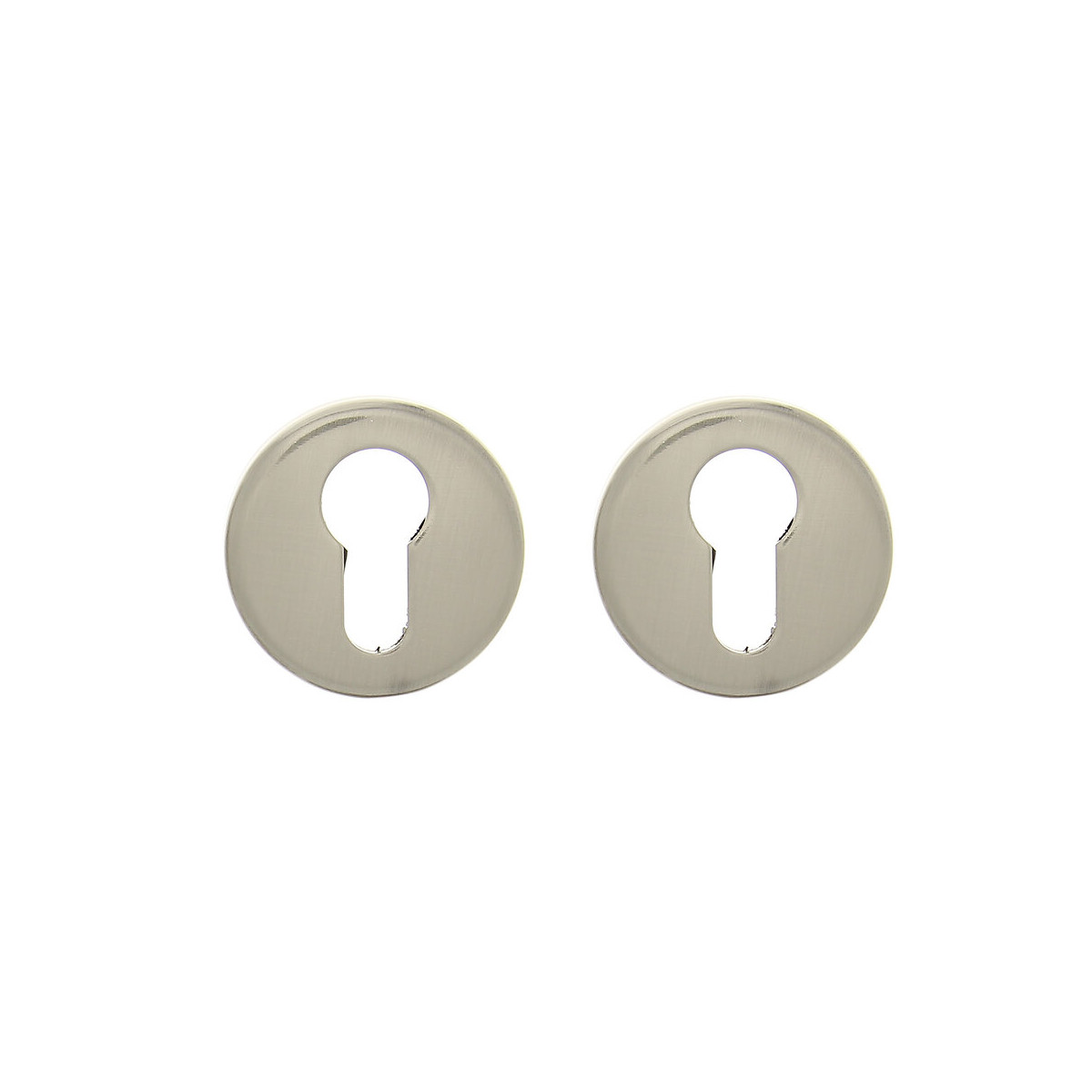 Rosaces avec trou de cylindre en acier. Finition : nickel mat. Visserie fournie. Dimensions : 49 mm. Lot de 2 rosaces.Spécifications techniques