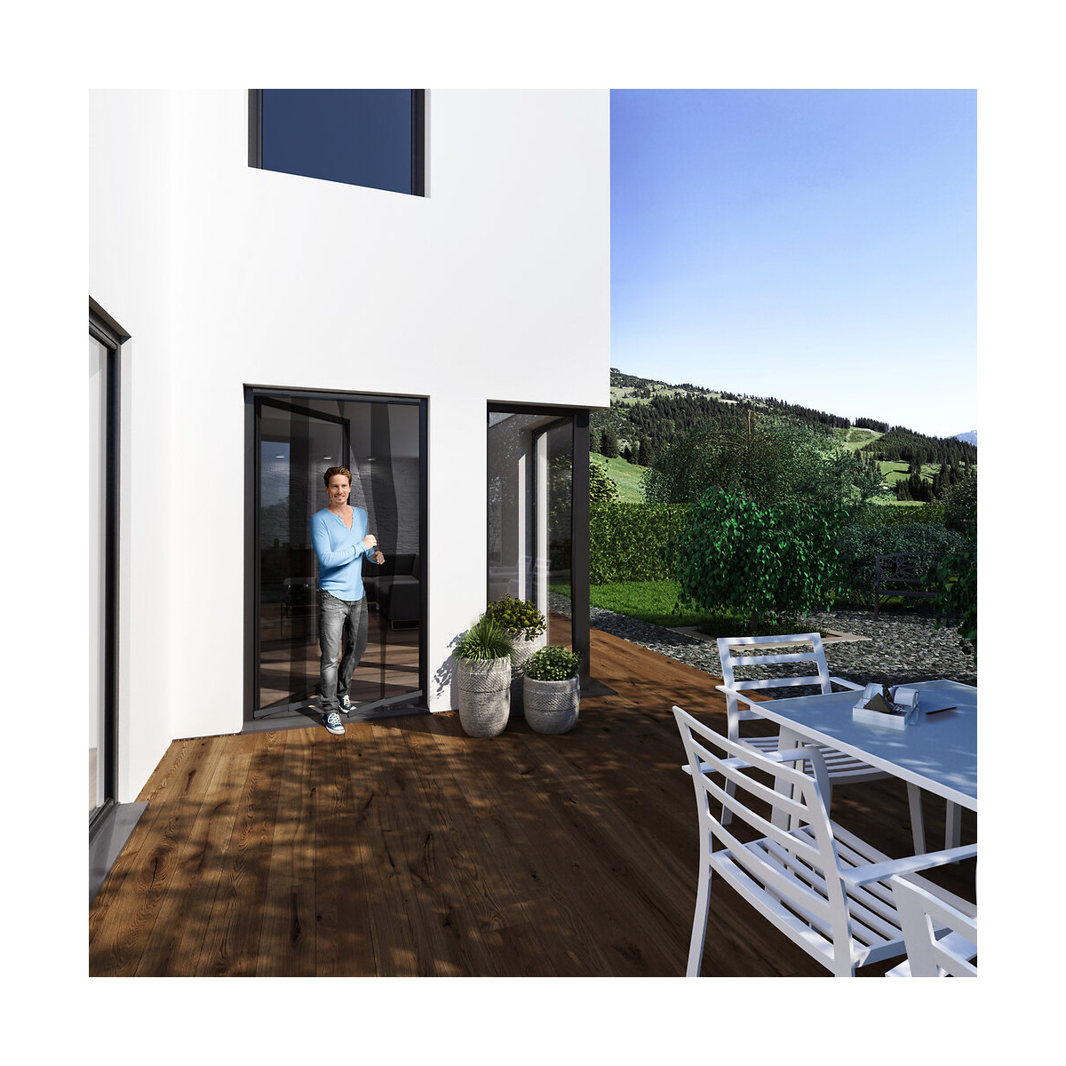 Rideau de porte moustiquaire téléscopique en PVC anthracite pour ouverture maximale de 120x250 cm. Rideau connstitué de 4 bandes verticales en fibre de verre qui se chevauchent pour une protection maximale. Adaptable à la dimension souhaitée. Se pose sans perçage sur le cadre de la porte à l'aide d'une bande auto aggripante et simple clip.